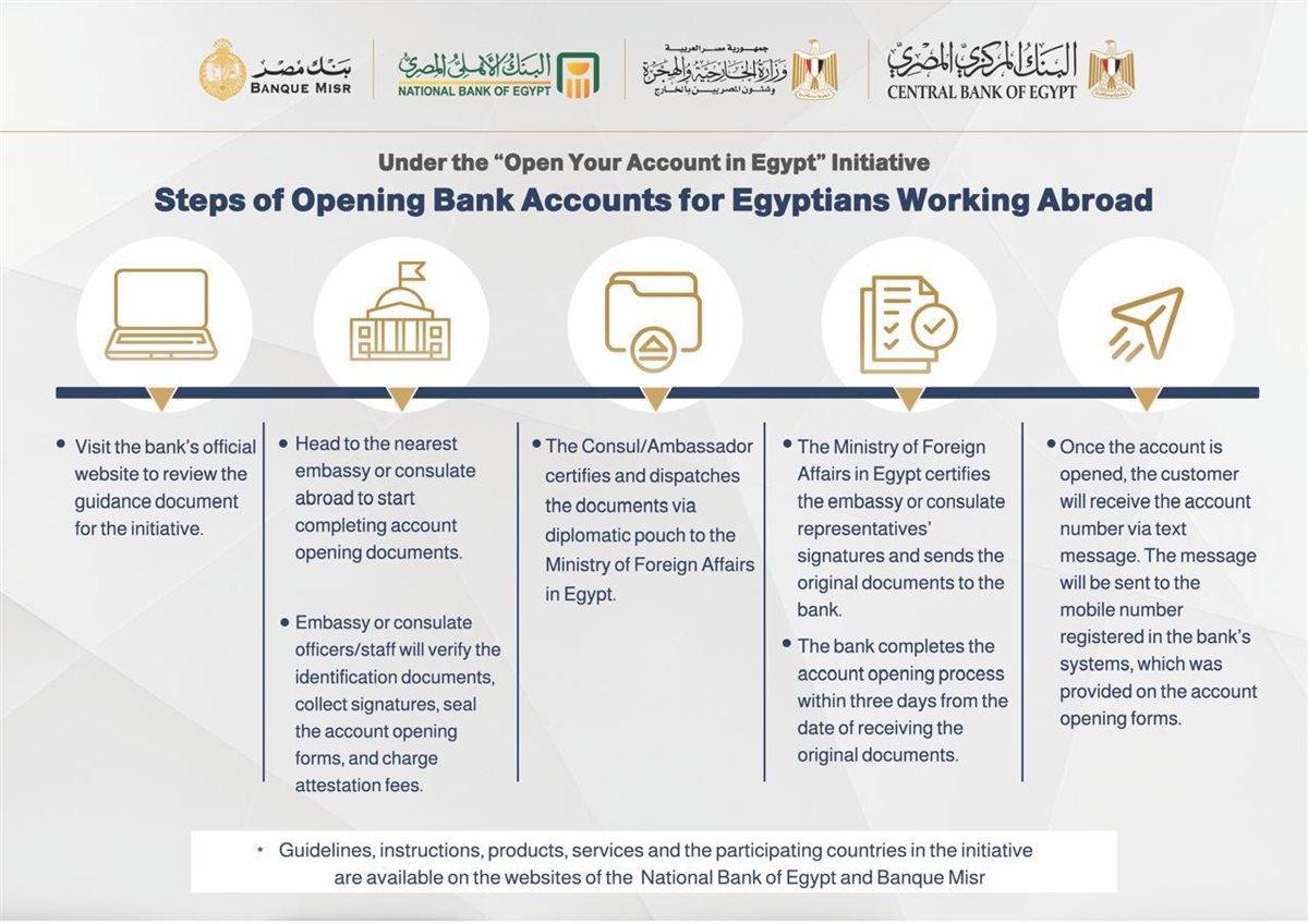 تماشيًا مع رؤية الدولة المصرية لتلبية احتياجات المصريين العاملين بالخارج وتيسير كافة الخدمات المقدمة لهم، أطلق البنك المركزي المصري، ووزارة الخارجية والهجرة وشئون المصريين بالخارج، مبادرة "افتح حسابك في مصر" بالتعاون مع البنك الأهلي المصري وبنك مصر.