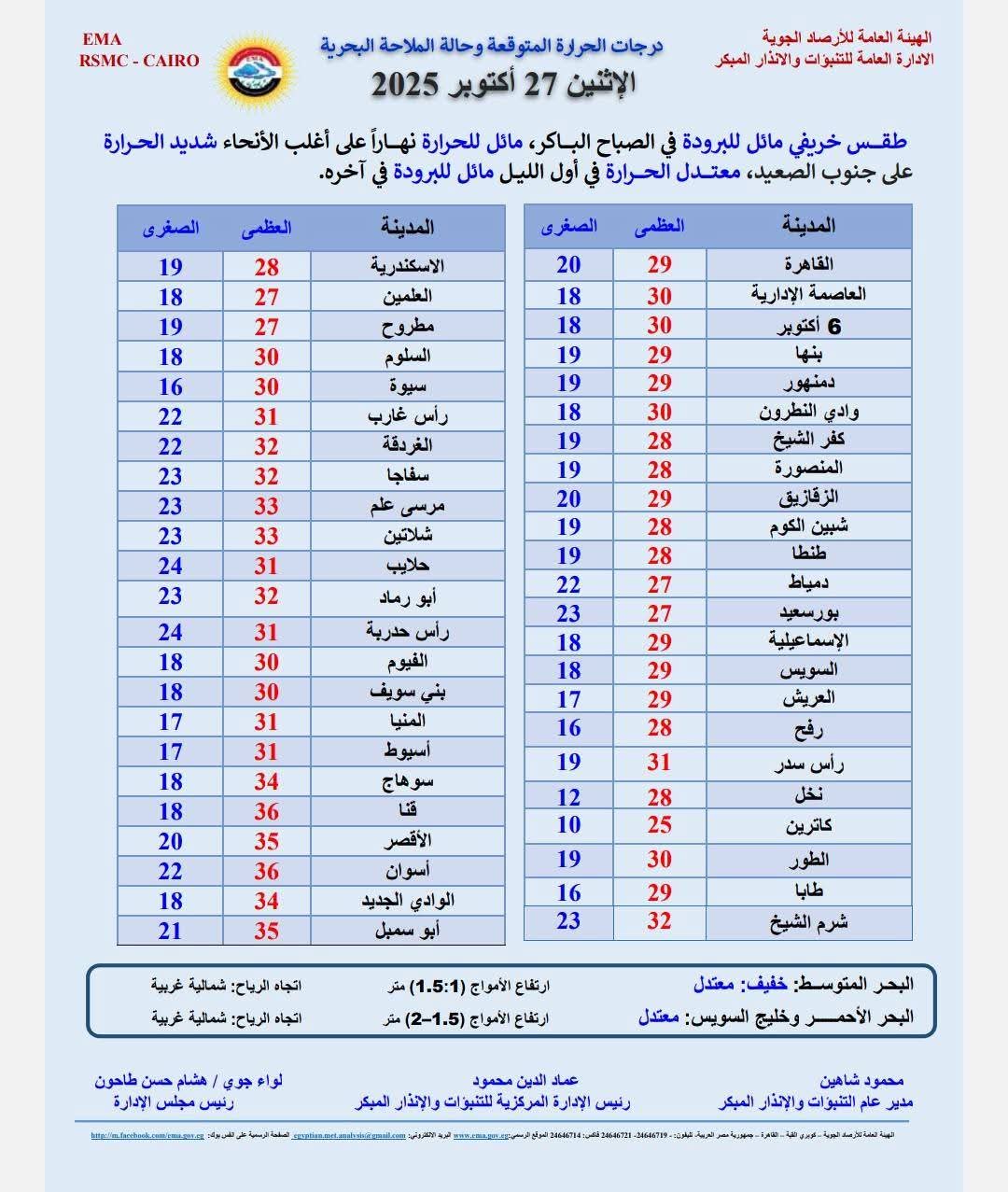 يشهد اليوم الاثنين الموافق 27 أكتوبر، استقرار درجات الحرارة والتي تصل إلى 29 في القاهرة، حيث تسود الأجواء الخريفية على أغلب الأنحاء، مع توقعات بسقوط أمطار خفيفة على بعض المناطق من السواحل الشمالية وشمال الوجه البحرى على فترات متقطعة.