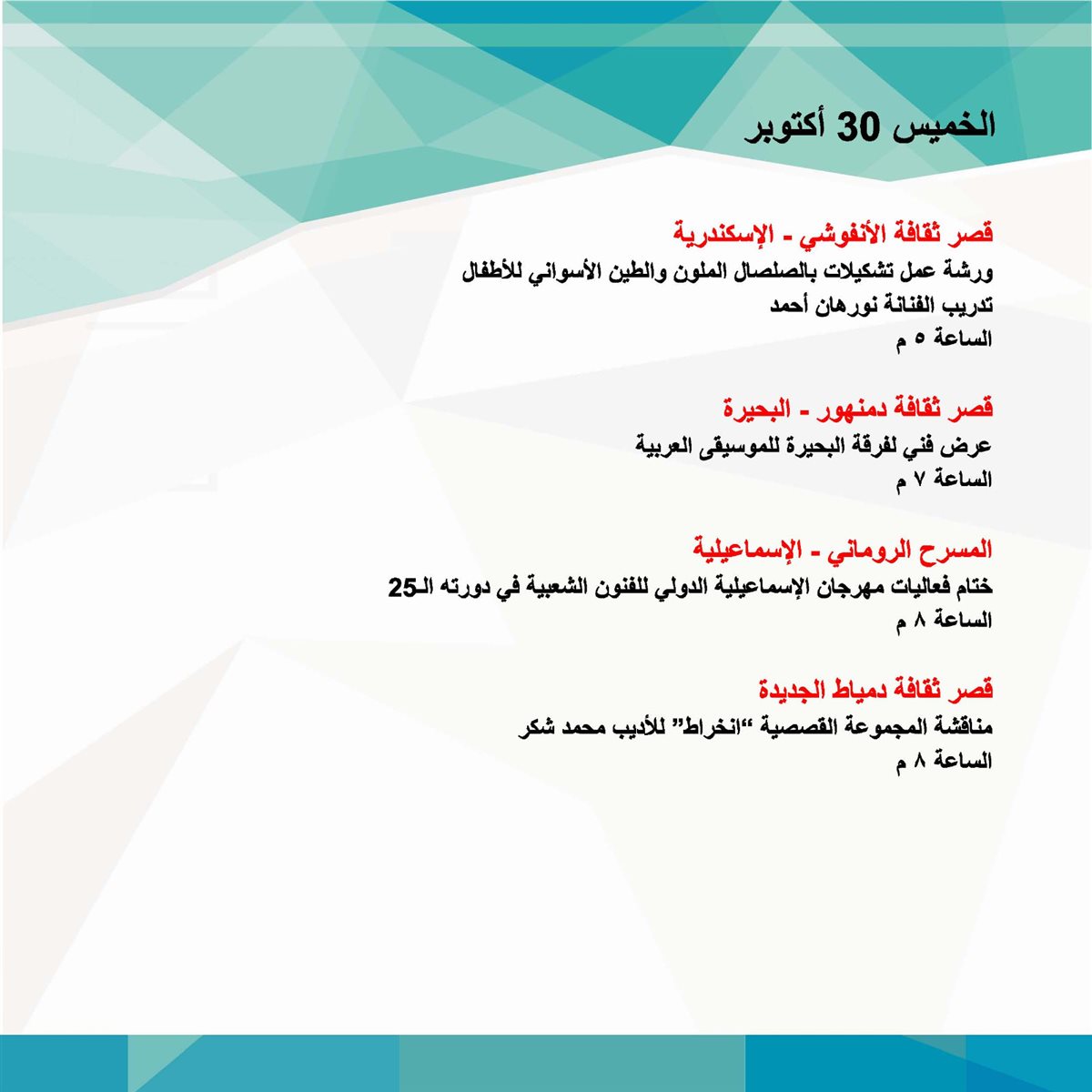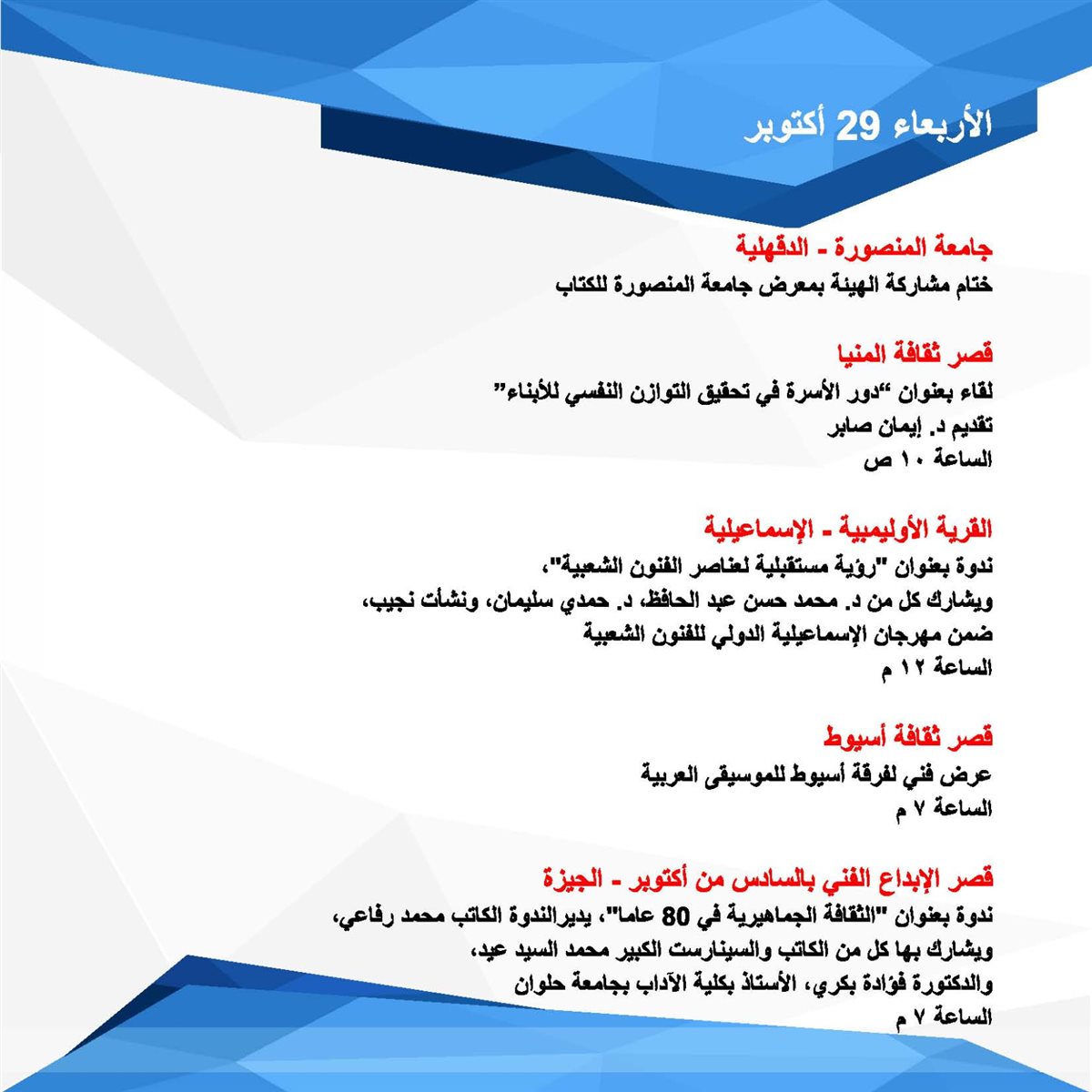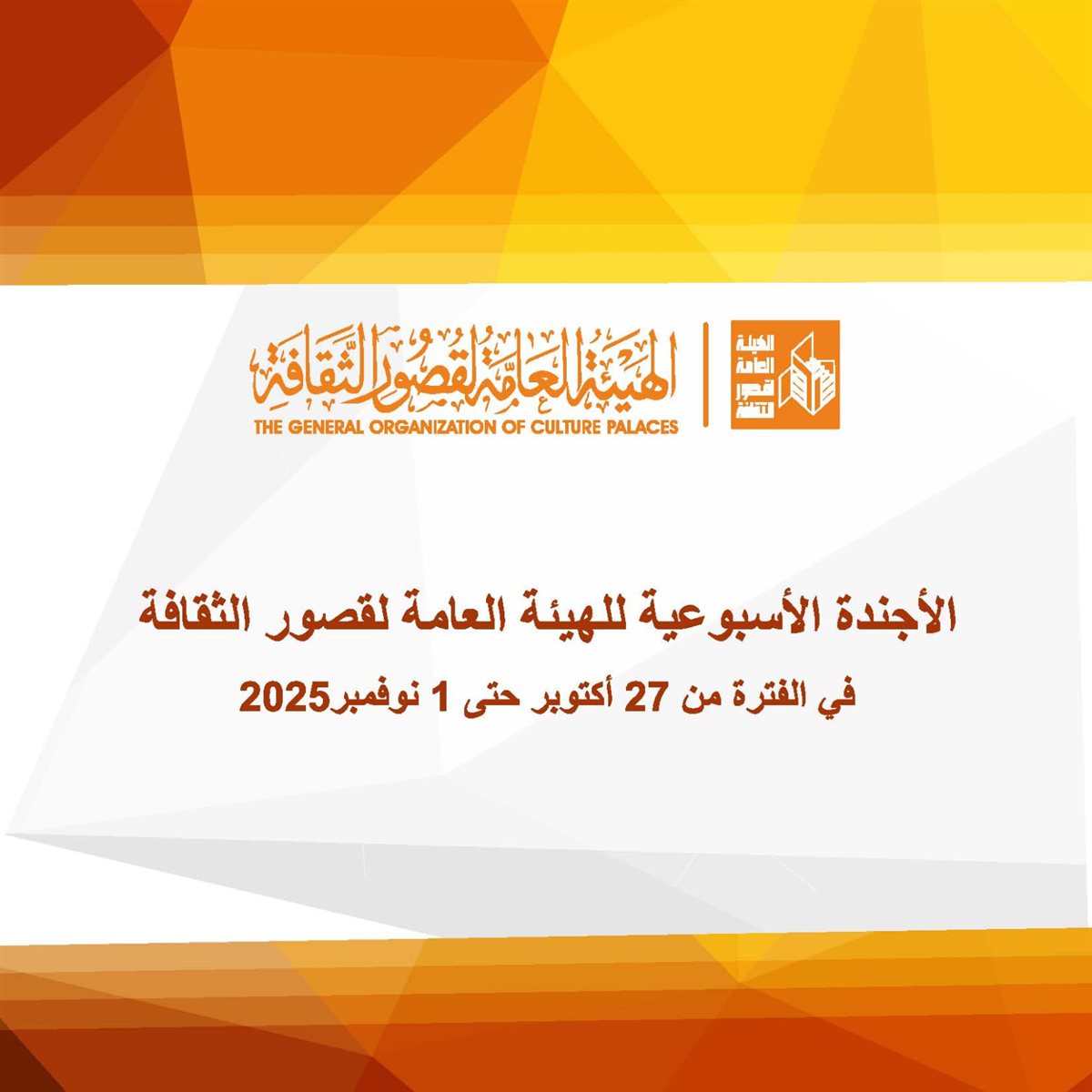تقدم الهيئة العامة لقصور الثقافة برعاية الدكتور أحمد فؤاد هنو وزير الثقافة، وبرئاسة اللواء خالد اللبان، أجندة فعاليات ثقافية وفنية ثرية ومتنوعة، تنطلق اليوم الاثنين وتستمر حتى السبت 1 نوفمبر المقبل، في إطار برامج وزارة الثقافة الهادفة إلى نشر الوعي الثقافي والفني بمختلف ربوع الجمهورية.