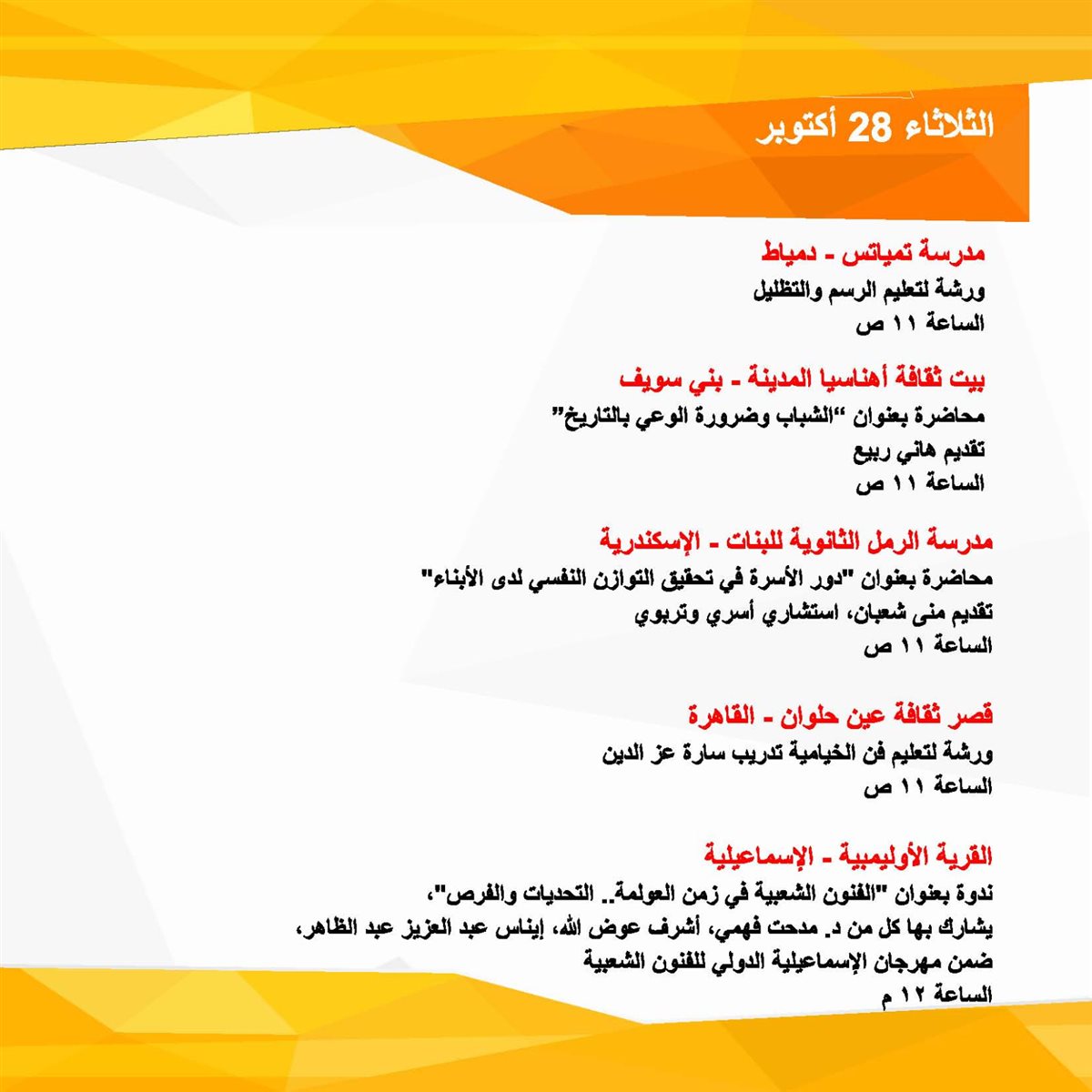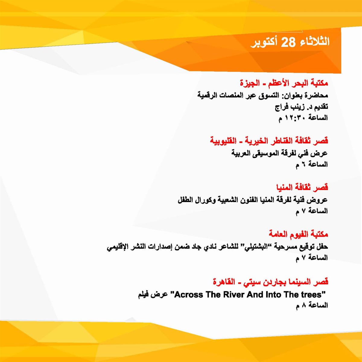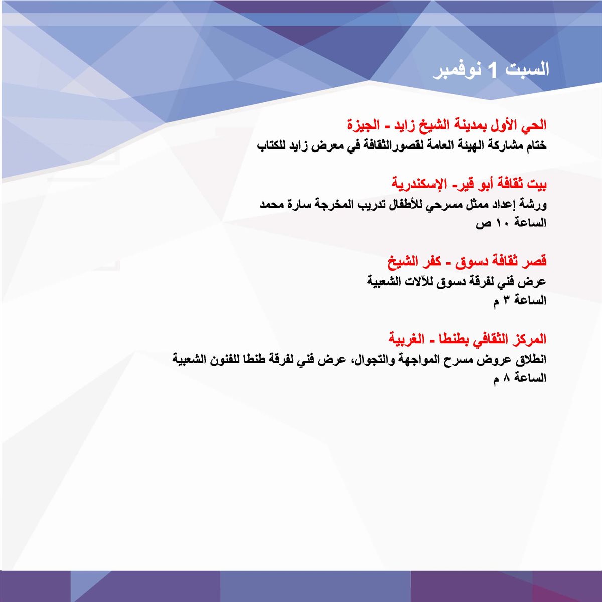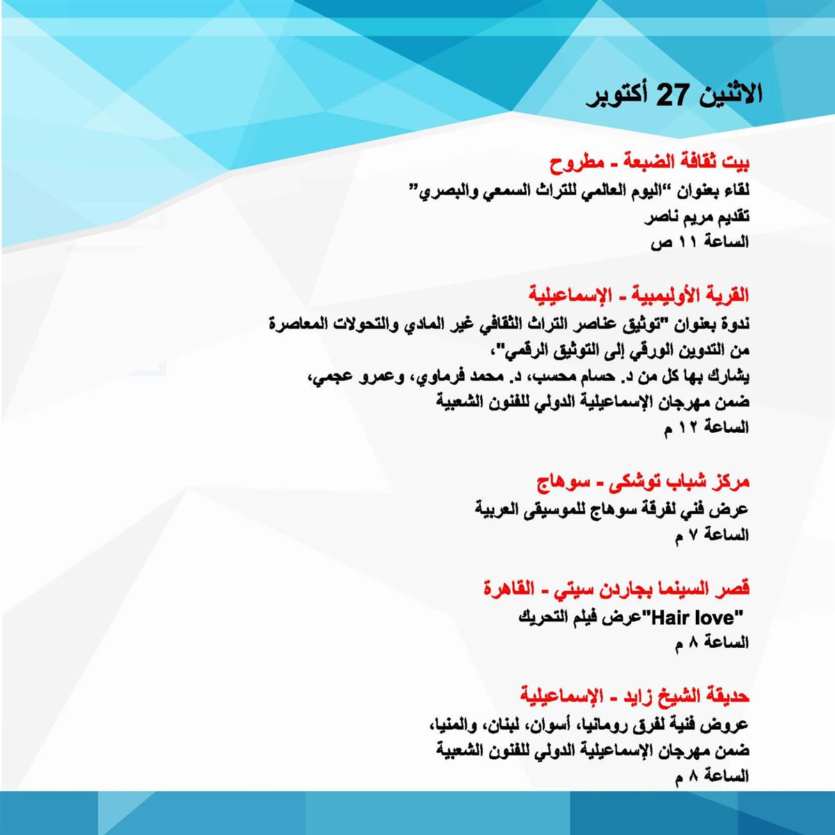 تقدم الهيئة العامة لقصور الثقافة برعاية الدكتور أحمد فؤاد هنو وزير الثقافة، وبرئاسة اللواء خالد اللبان، أجندة فعاليات ثقافية وفنية ثرية ومتنوعة، تنطلق اليوم الاثنين وتستمر حتى السبت 1 نوفمبر المقبل، في إطار برامج وزارة الثقافة الهادفة إلى نشر الوعي الثقافي والفني بمختلف ربوع الجمهورية.