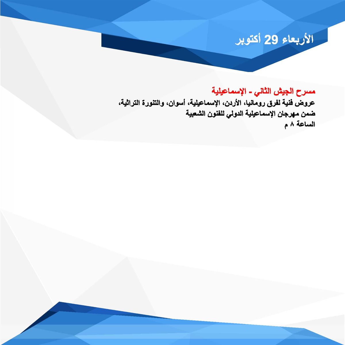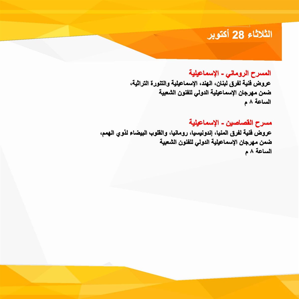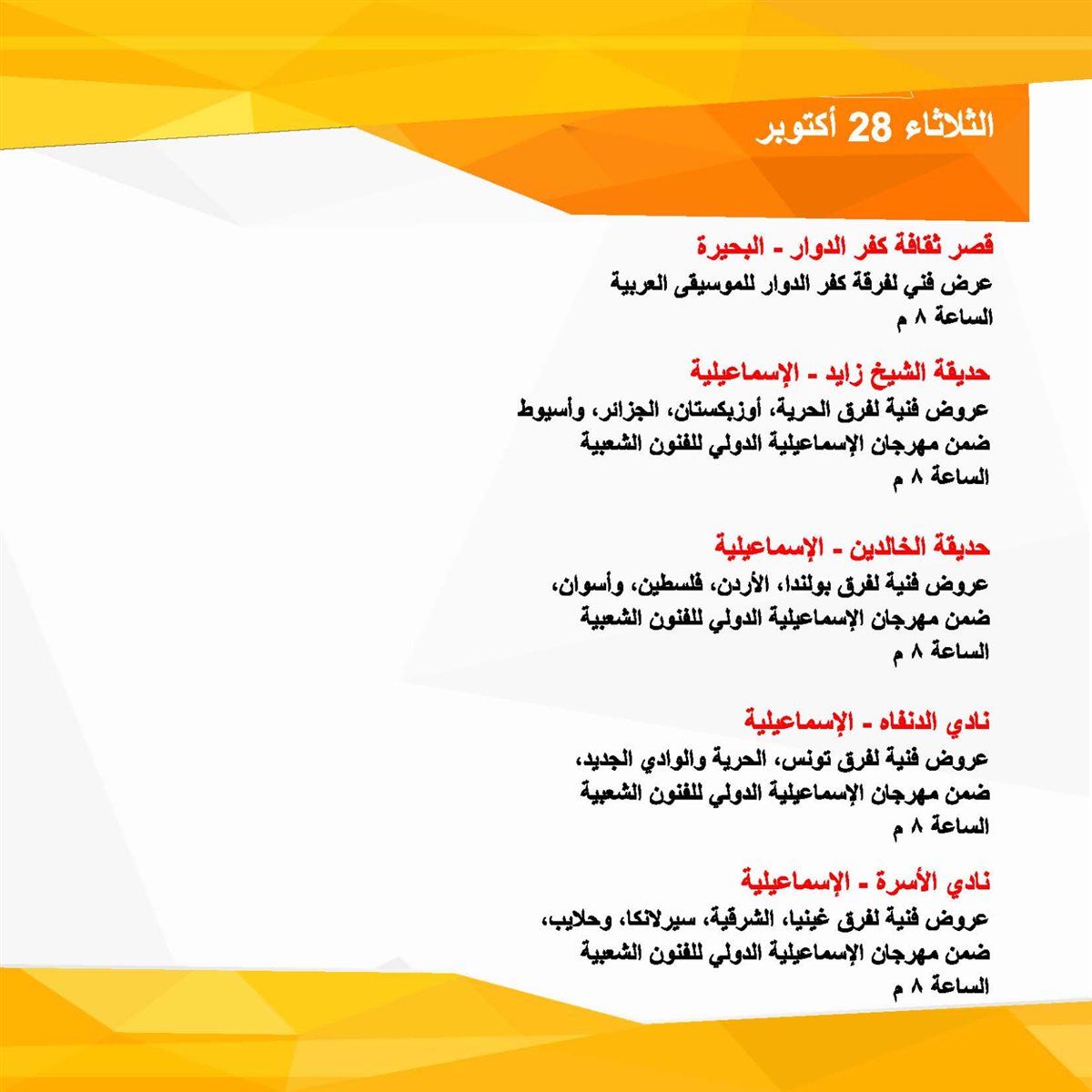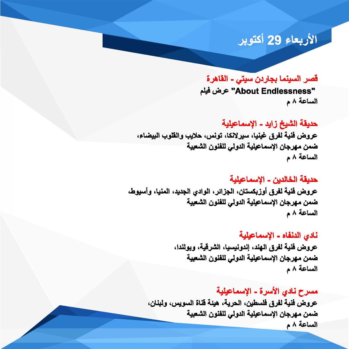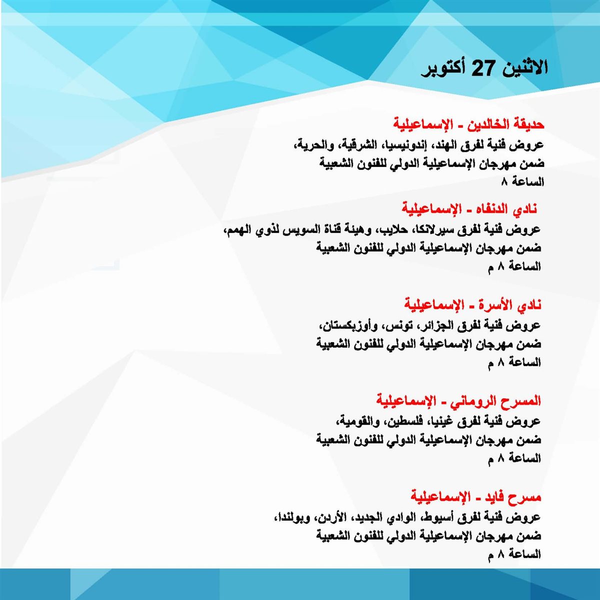 يشهد اليوم الاثنين عروضا فنية متنوعة ضمن فعاليات مهرجان الإسماعيلية الدولي للفنون الشعبية في دورته الخامسة والعشرين.