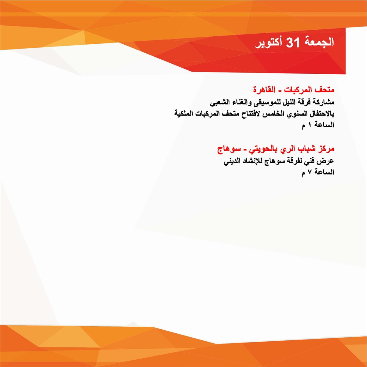 وتحفل الأجندة أيضا بمجموعة من اللقاءات التثقيفية والأدبية بحضور نخبة من المثقفين والأدباء، إلى جانب الورش الفنية والحرفية بالمحافظات، والفعاليات الخاصة بالاحتفال باليوم العالمي للتراث السمعي والبصري، وإعادة افتتاح متحف المركبات الملكية بعد التجديد والتطوير.