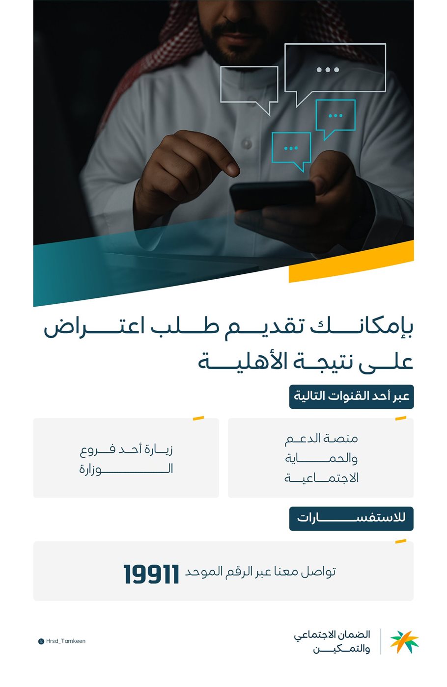 يذكر أن الضمان الاجتماعي دعا من تظهر لهم نتيجة الأهلية "غير مؤهل" تقديم اعتراض، وقال:"لا تتردد في التوجه إلى قنوات الاعتراض من منصة الدعم والحماية أو زيارة أحد فروع الوزارة أو التواصل مع 19911 لمزيد من المعلومات".