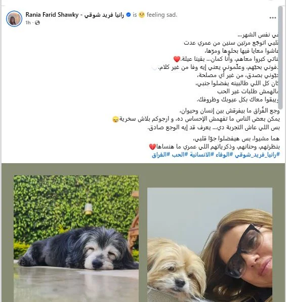 وأضافت النجمة رانيا فريد شوقي أن ألم الفقد لا يفرّق بين إنسان وحيوان، موضحة: "يمكن بعض الناس ما تفهمش الإحساس ده، وأرجوكم بلاش سخرية، بس اللي عاش التجربة دي يعرف قد إيه الوجع صادق، هما مشيوا بس هيفضلوا جوا قلبي بنظرتهم وحنانهم وذكرياتهم اللي عمري ما هنساها".