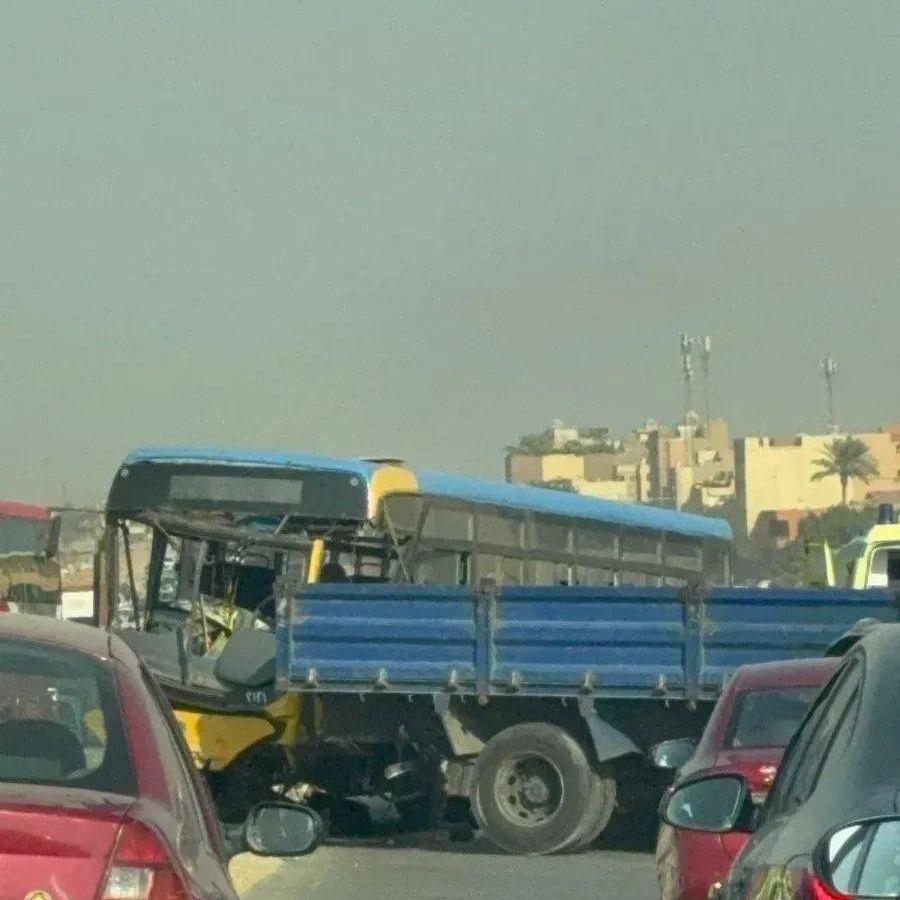 تصادم أتوبيس بحاجز خرساني على الطريق السياحي في اتجاه المنيب| صور