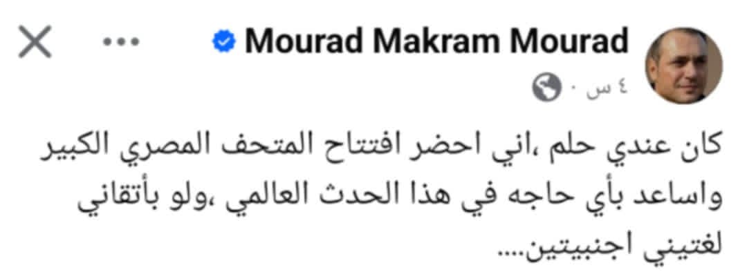 نشر الفنان مراد مكرم منشورًا عبر حسابه الرسمي على موقع التواصل الاجتماعي فيسبوك عبر فيه عن حلمه بالمشاركة في الحدث العالمي المنتظر، افتتاح المتحف المصري الكبير.