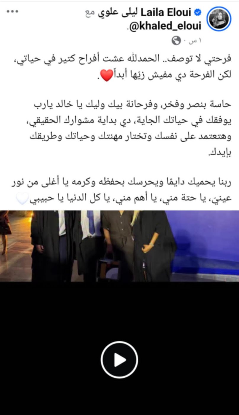 وتابعت:"حاسة بنصر وفخر، وفرحانة بيك وليك يا خالد، يارب يوفقك في حياتك الجاية، دي بداية مشوارك الحقيقي، وهتعتمد على نفسك وتختار مهنتك وحياتك وطريقك بإيدك، ربنا يحميك دايمًا ويحرسك بحفظه وكرمه يا أغلى من نور عينيّ، يا حتة مني، يا أهم مني، يا كل الدنيا يا حبيبي🤍".