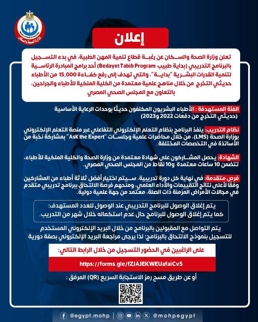 أعلنت وزارة الصحة والسكان عن رغبة قطاع تنمية المهن الطبية، في بدء التسجيل بالبرنامج التدريبي بداية طبيب (Bedayet Tabib Program)، أحد برامج المبادرة الرئاسية لتنمية القدرات البشرية “بداية”، والتي تهدف إلى رفع كفاءة 15,000 من الأطباء حديثي التخرج من خلال مناهج علمية معتمدة من الكلية الملكية للأطباء والجراحين، بالتعاون مع المجلس الصحي المصري.