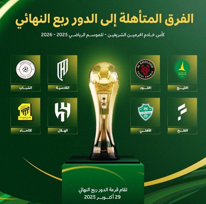 تقام اليوم الأربعاء قرعة الدور ربع النهائي من بطولة كأس خادم الحرمين الشريفين لكرة القدم، والتي تشهد مشاركة 8 فرق نجح في حسم تأهلها رسميًا بعد انتصارها دور الـ16.