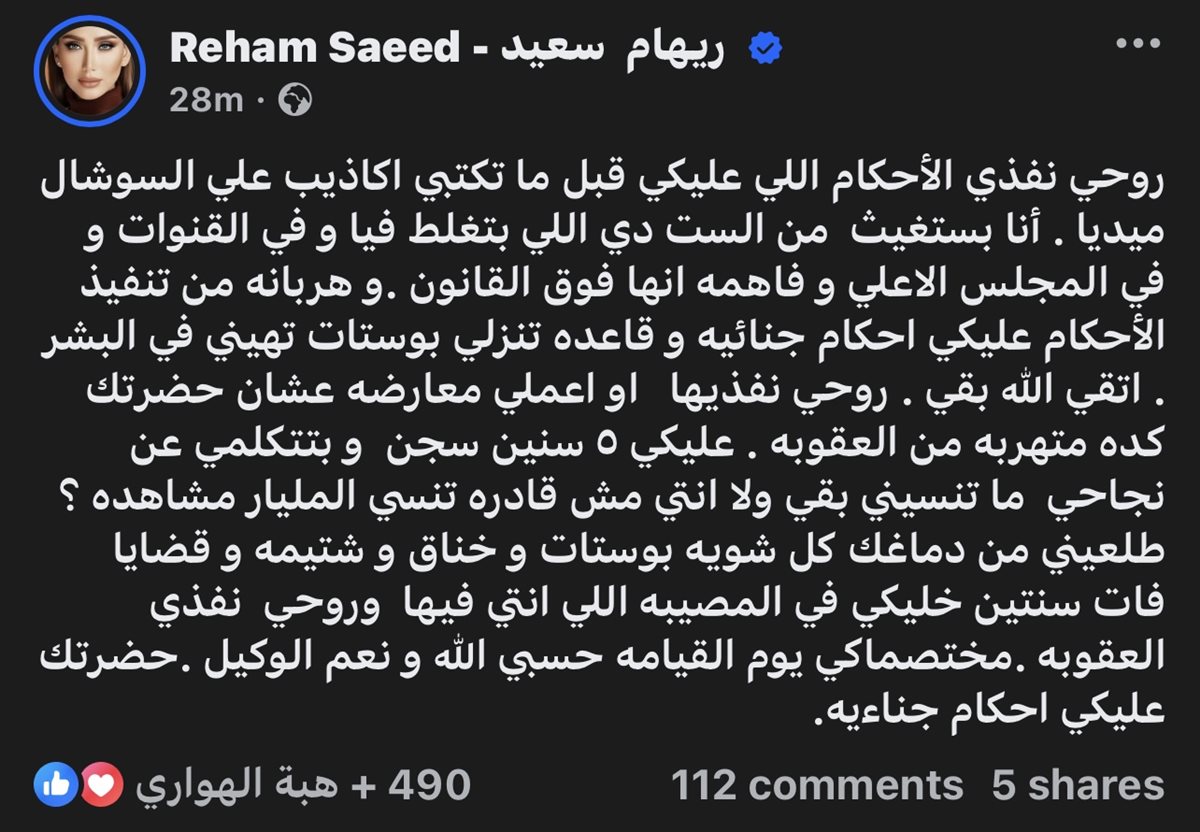 كتبت ريهام سعيد: “روحي نفذي الأحكام اللي عليكي قبل ما تكتبي اكاذيب علي السوشال ميديا . أنا يستغيث من الست دي الي بتغلط فيه و في القنوات و في المجلس الاعلي و فاهمه انها فوق القانون”.