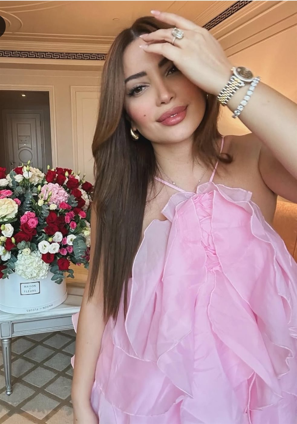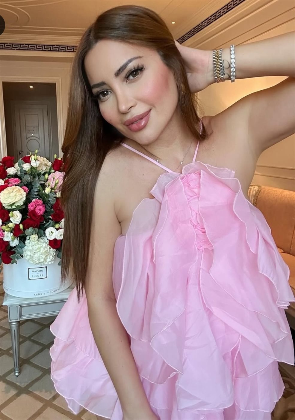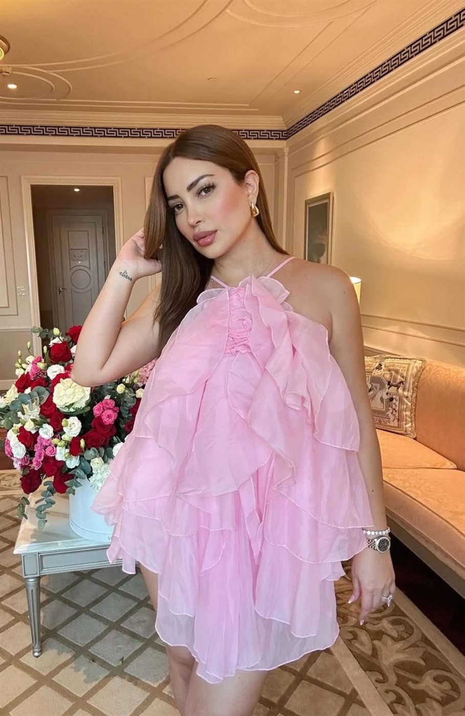 وبدت نسرين طافش بإطلالة وردية مفعمة بالأنوثة والجاذبية في آن واحد، مرتديه فستان قصير فضفاض صمم من قماش الحرير باللون البمبي لتشبه الزهرة في بستان الربيع، عاسكه رشاقة قوامها والمتناسق.