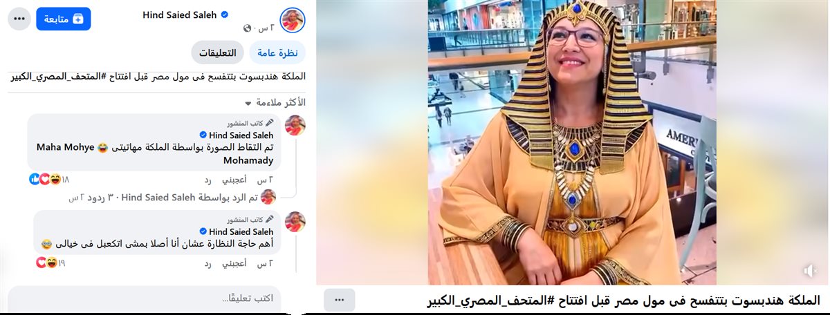وظهرت هند في الفيديو بروحها المرحة المعهودة، وعلقت قائلة: «الملكة هندبسوت بتتفسح في مول مصر قبل افتتاح #المتحف_المصري_الكبير»، في إشارة طريفة إلى الملكة الفرعونية الشهيرة حتشبسوت.