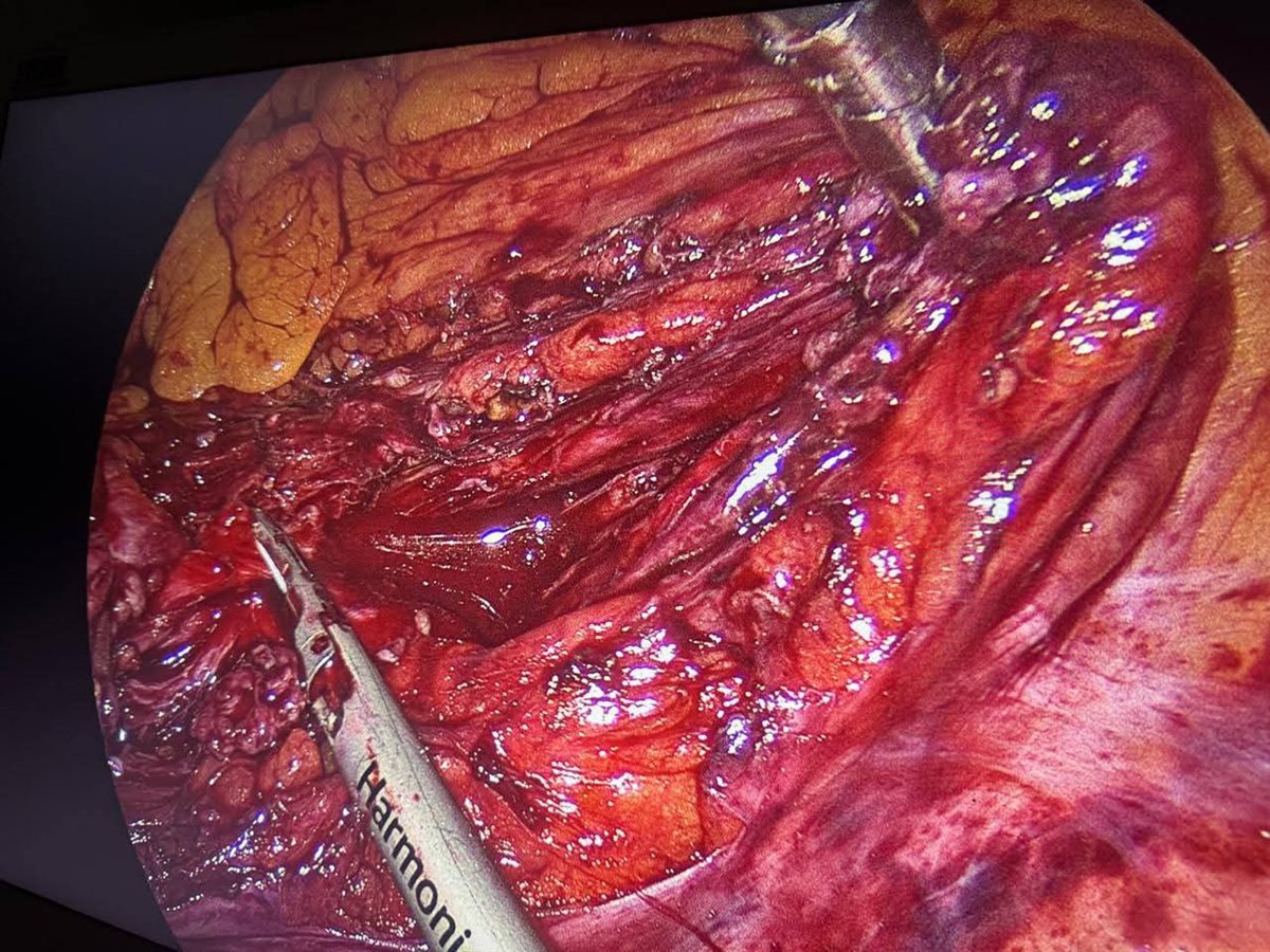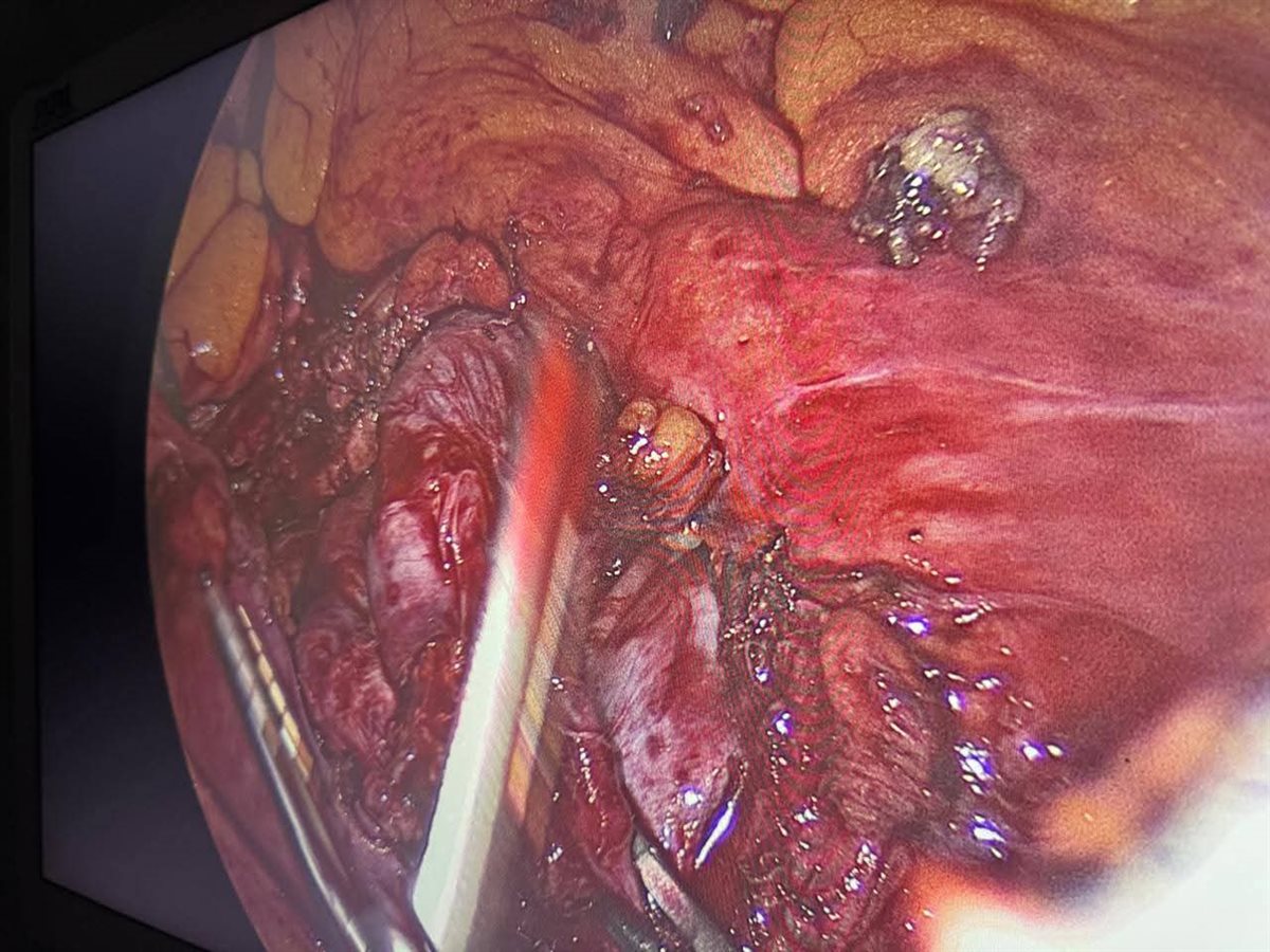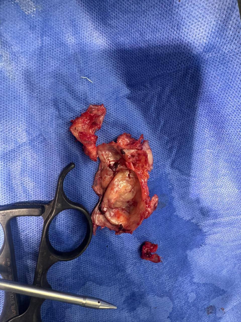 حيث أظهرت الفحوصات الطبية والأشعة المقطعية وجود كيس بحجم 6×7 سم بالجانب الأيسر من البطن يُشتبه في كونه كيسًا مساريقيًا (Mesenteric cyst)، وتم بفضل الله استئصاله بالكامل باستخدام المنظار الجراحي، بعد استكشاف البطن وتحديد موضع الكيس بدقة خلف الغشاء البريتوني، وقد تمت العملية بنجاح تام دون أي مضاعفات.