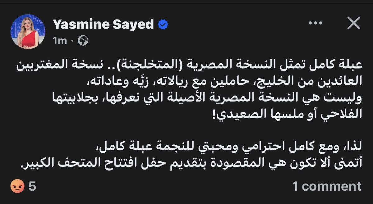 وأضافت: “وليست هي النسخة المصرية الأصيلة التي نعرفها، بجلابيتها الفلاحي أو ملسها الصعيدي! لذا، ومع كامل احترامي ومحبتي للنجمة عبلة كامل”.