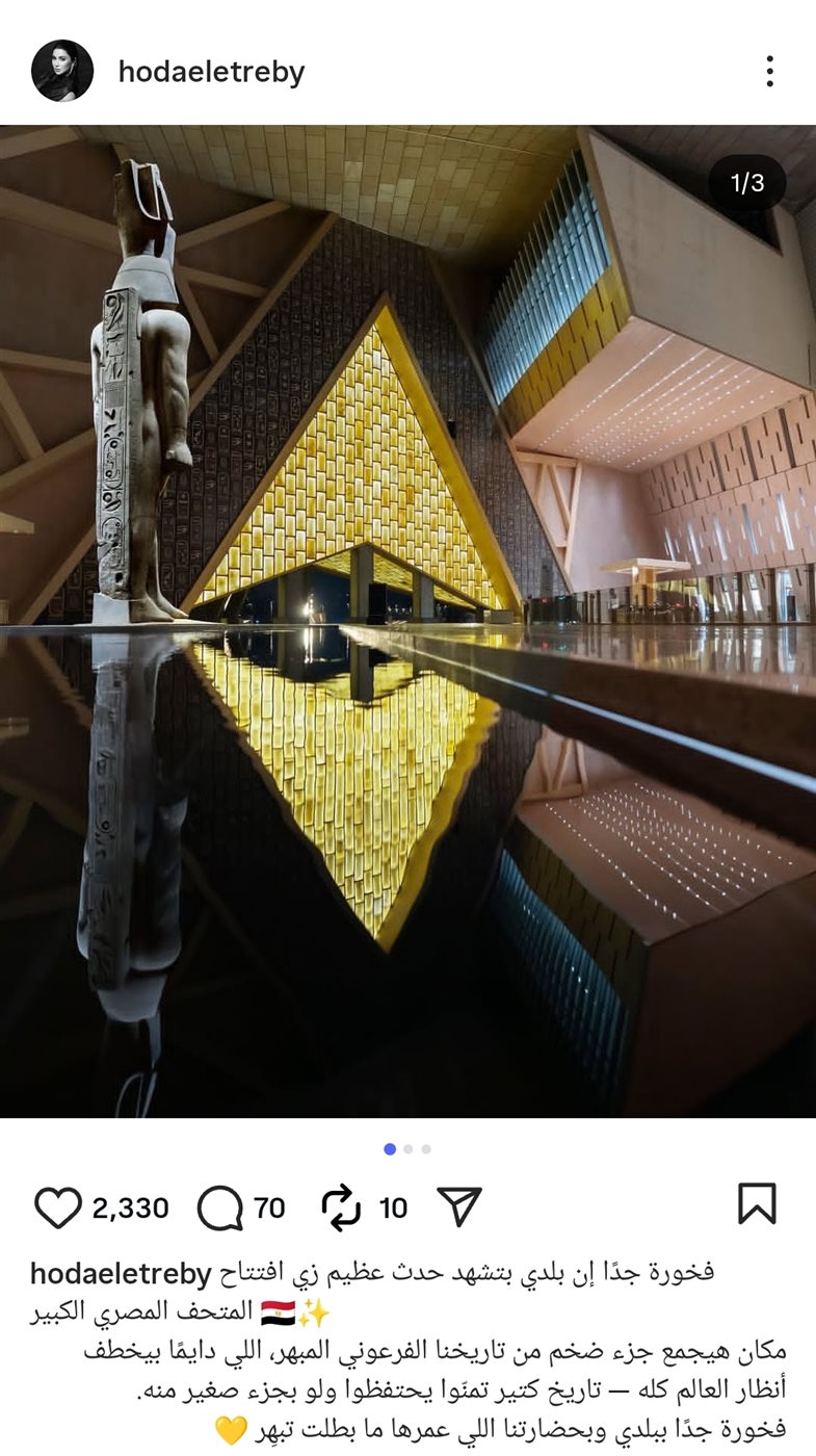 وكتبت هدى : "فخورة جدًا إن بلدي بتشهد حدث عظيم زي افتتاح المتحف المصري الكبير مكان هيجمع جزء ضخم من تاريخنا الفرعوني المبهر، اللي دايمًا بيخطف أنظار العالم كله تاريخ كتير تمنّوا يحتفظوا ولو بجزء صغير منه.. فخورة جدًا ببلدي وبحضارتنا اللي عمرها ما بطلت تبهِر".