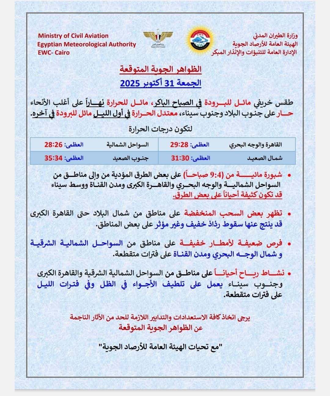 أعلنت الهيئة العامة للأرصاد الجوية التابعة لوزارة الطيران المدني أن البلاد تشهد غدًا الجمعة 31 أكتوبر 2025 طقسًا خريفيًا معتدلًا بوجه عام، مائلًا للبرودة في الصباح الباكر، ومائلًا للحرارة نهارًا على أغلب الأنحاء، حارًا على جنوب البلاد وجنوب سيناء، بينما يكون معتدل الحرارة في أول الليل ومائلًا للبرودة في آخره.