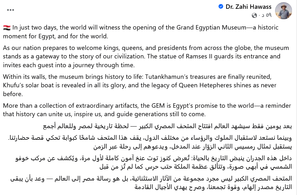 وكتب حواس في منشوره: "بعد يومين فقط سيشهد العالم افتتاح المتحف المصري الكبير — لحظة تاريخية لمصر وللعالم أجمع. وبينما نستعد لاستقبال الملوك والرؤساء من مختلف الدول، يقف هذا المتحف شامخًا كبوابة تحكي قصة حضارتنا، يستقبل تمثال رمسيس الثاني الزوّار عند المدخل، ويدعوهم إلى رحلة عبر الزمن."