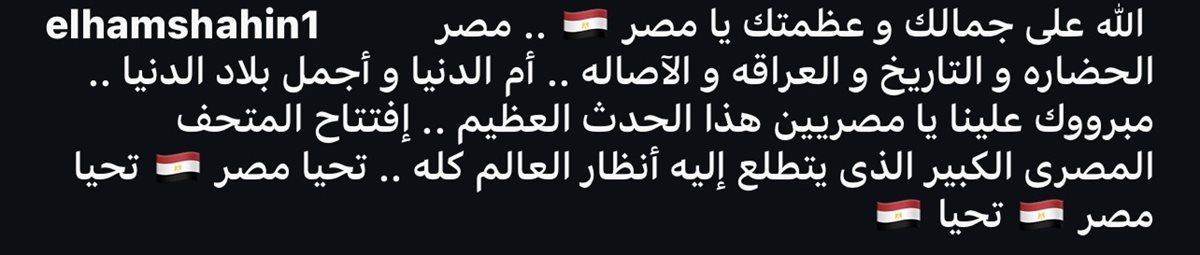 وأضافت: “مبرووك علينا يا مصريين هذا الحدث العظيم .. إفتتاح المتحف المصرى الكبير الذي يتطلع إليه أنظار العالم كله .. تحيا مصر .. تحيا مصر”.