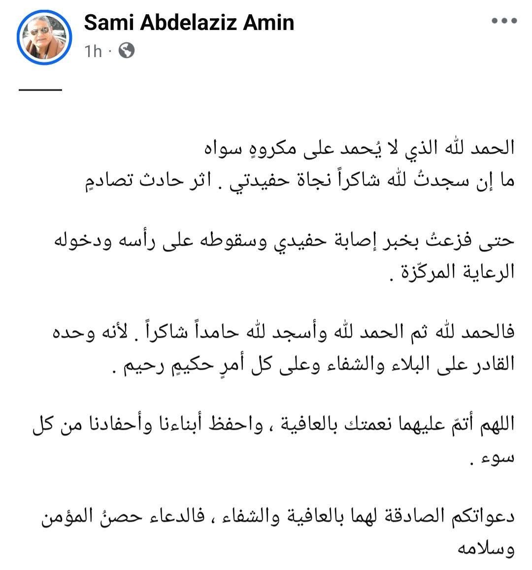 وكتب سامي عبد العزيز عبر حسابه الشخصي بالموقع الأشهر فيس بوك: "الحمد لله الذي لا يُحمد على مكروه سواه، ما إن سجدتُ لله شاكراً نجاة حفيدتي إثر حادث تصادم، حتى فزعتُ بخبر إصابة حفيدي وسقوطه على رأسه ودخوله الرعاية المركّزة".