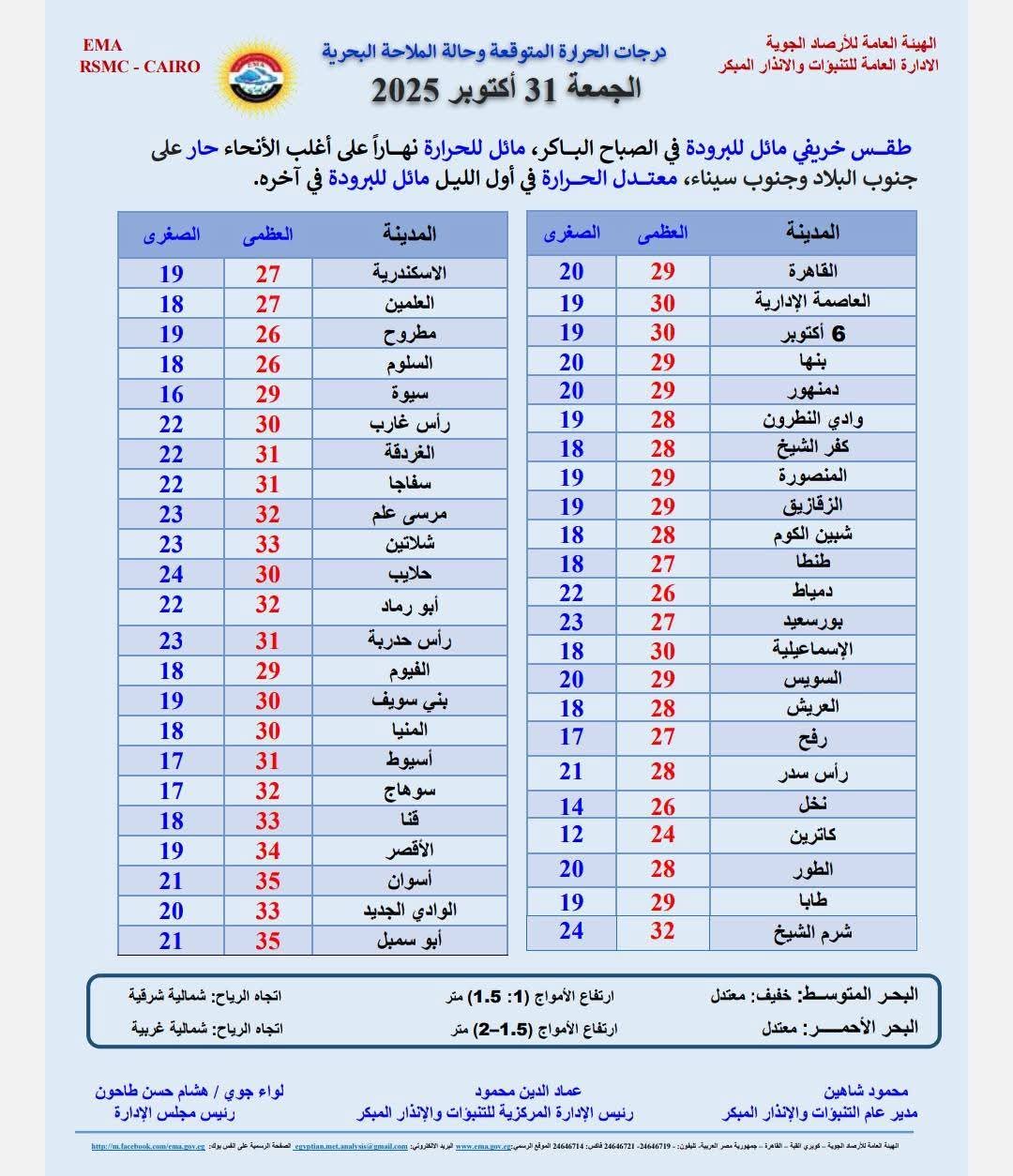 الطقس ودرجات الحرارة.. يشهد اليوم الجمعة الموافق 31 أكتوبر، طقسًا خريفيًا على أغلب المناطق، لتكون الأجواء مائلة للبرودة في الصباح الباكر ومائلة للحرارة نهاراً على أغلب الأنحاء حارة على جنوب سيناء وجنوب البلاد.