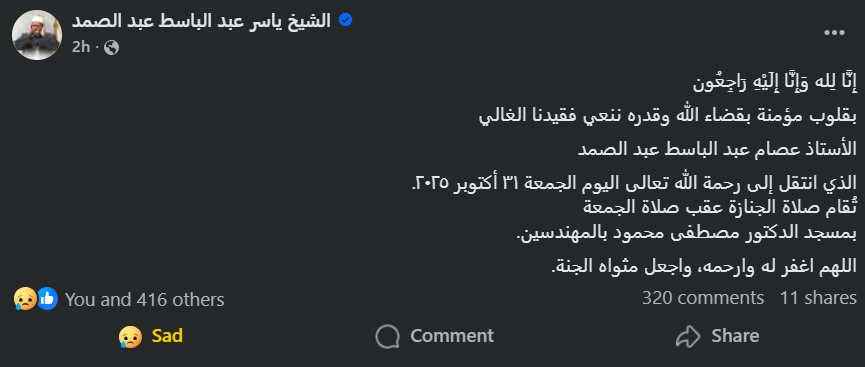 وقال الشيخ ياسر: “إنَّا لِله وَإِنَّا إِلَيْهِ رَاجِعُون .. بقلوب مؤمنة بقضاء الله وقدره ننعي فقيدنا الغالي الأستاذ عصام عبد الباسط عبد الصمد الذي انتقل إلى رحمة الله تعالى اليوم الجمعة ٣١ أكتوبر ٢٠٢٥”.