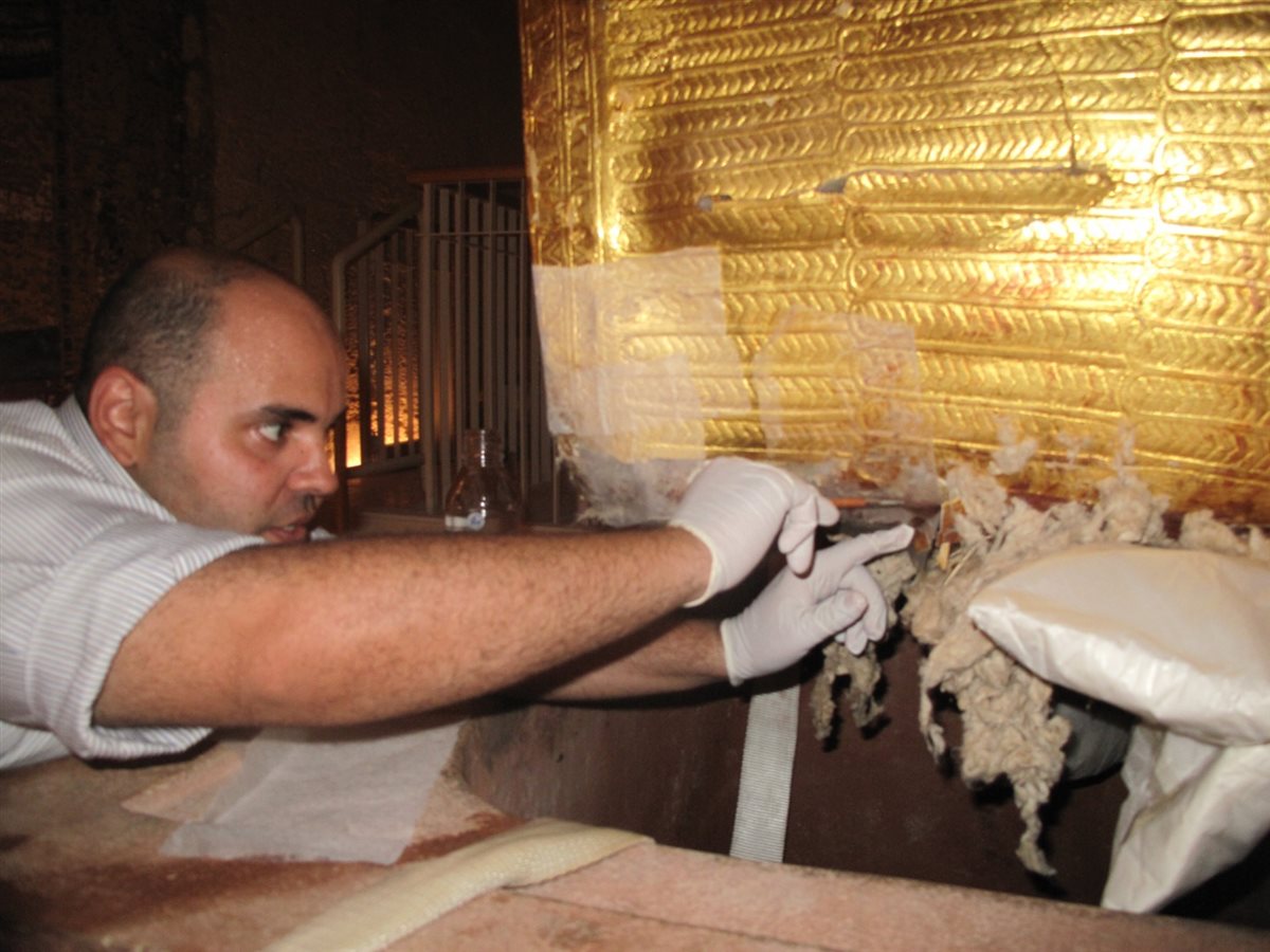 التابوت الذهبي الكبير الذي يعد من أكثر القطع تعقيدًا وخطورة في التعامل من حيث الحالة الحفظية والخصائص المادية، فقد كان التابوت في حالة ضعف شديدة كما تحدثنا نتيجة تأثيرات الرطوبة والتقلبات الحرارية داخل المقبرة على مدار نحو قرن من الزمان.