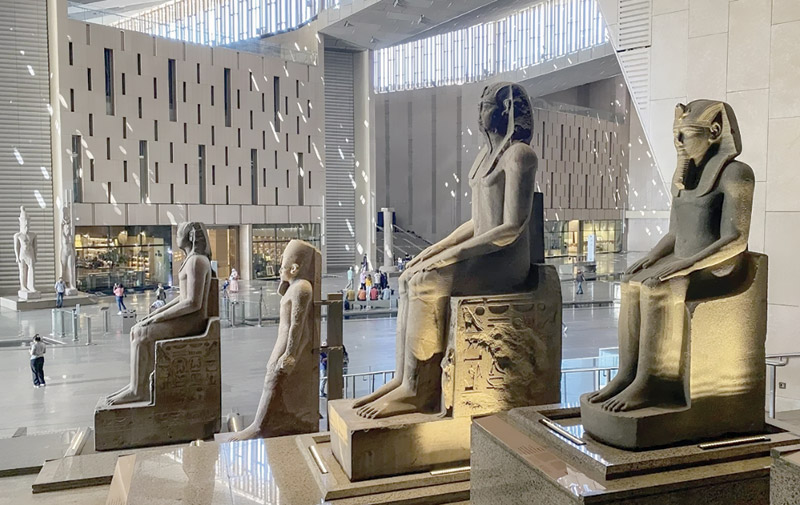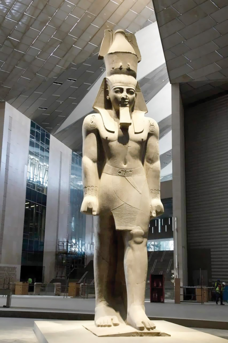 ويشير الى ان المتحف يوصف بأنه الهرم الرابع بفضل واجهته الزجاجية المثلثة التى صممتها شركة ايرلندية لتعكس شكل أهرام الجيزة المجاورة ما يجعله مزيجا مبهرا من العمارة الحديثة والتراث القديم. اما ثالثا فيتوقف التقرير عند تمثال رمسيس الثانى الذى يقف شامخا فى قلب المتحف بارتفاع 11 مترا بعد رحلة طويلة بين ممفيس والعواصم العالمية ليجسد عودة الفرعون الى موطنه الأصلى كرمز لاستعادة مصر لكنوزها التاريخية.