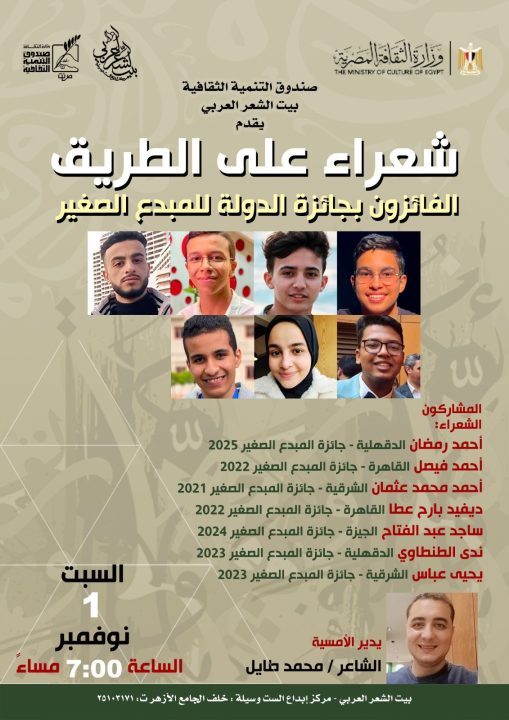 ويدير الأمسية الشاعر محمد طايل، بمشاركة هؤلاء الشعراء الصغار الذين يمثلون جيلًا جديدًا من الأصوات الواعدة في مسيرة الشعر العربي، بما يعكس استمرار تجدد الإبداع في الأجيال الشابة.
