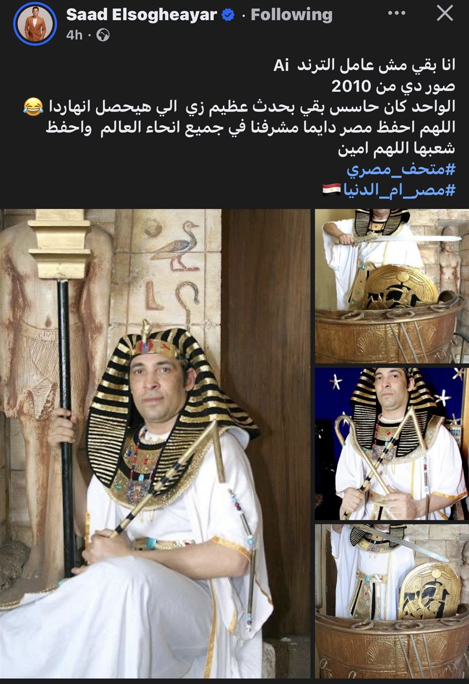 أكد سعد الصغير أن صوره بالزي الفرعوني حقيقية وليست مصممة بتقنية الذكاء الإصطناعي، حيث قال: “أنا بقي مش عامل الترند Ai .. الصور دي من 2010 .. الواحد كان حاسس بقي بحدث عظيم زي الي هيحصل انهارده”.