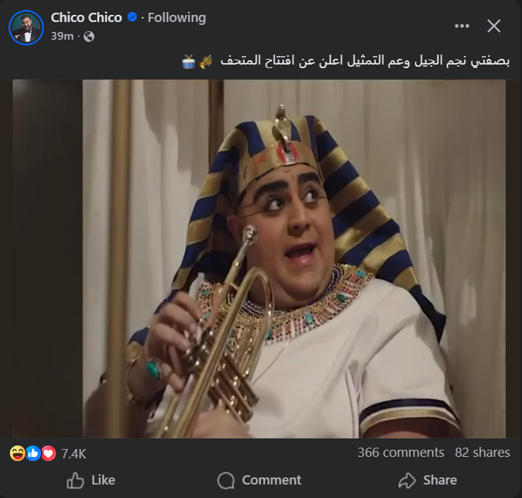 احتفل الفنان شيكو بافتتاح المتحف المصري الكبير على طريقته الخاصة، مستعينًا بمشهد له من فيلم “الحرب العالمية الثالثة”، وهو يرتدي الزي الفرعوني، داخل متحف الشمع، الذي يضم مجموعة تماثيل لأشهر شخصيات التاريخ، مثل توت عنخ آمون، والزعيم أحمد عرابي، وغاندي، ورأفت الهجان، وأم كلثوم، وكذلك أفراد من الجيش المصري في حرب أكتوبر.