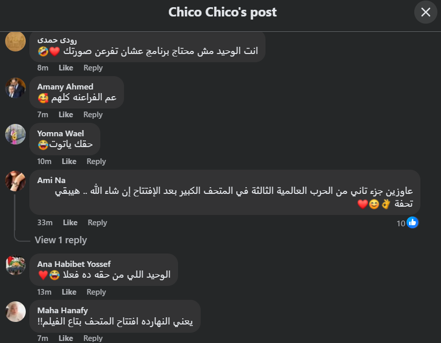 نشر شيكو لقطة من الفيلم وأرفقها بتعليق قائلًا: “بصفتي نجم الجيل وعم التمثيل أعلن عن افتتاح المتحف”، ليطالبه الجمهور في التعليقات بعمل جزء ثانِ من فيلم “الحرب العالمية الثالثة”، وتصويره داخل المتحف المصري الكبير بعد افتتاحه، مؤكدين أنها ستكون فكرة عبقرية.