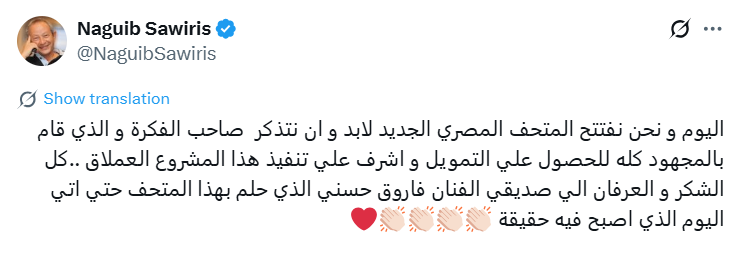 وقال ساويرس في تغريدته: "اليوم ونحن نفتتح المتحف المصري الجديد لابد أن نتذكر صاحب الفكرة، الذي قام بالمجهود كله للحصول على التمويل، وأشرف على تنفيذ هذا المشروع العملاق، كل الشكر والعرفان إلى صديقي الفنان فاروق حسني الذي حلم بهذا المتحف حتى أتى اليوم الذي أصبح فيه حقيقة".