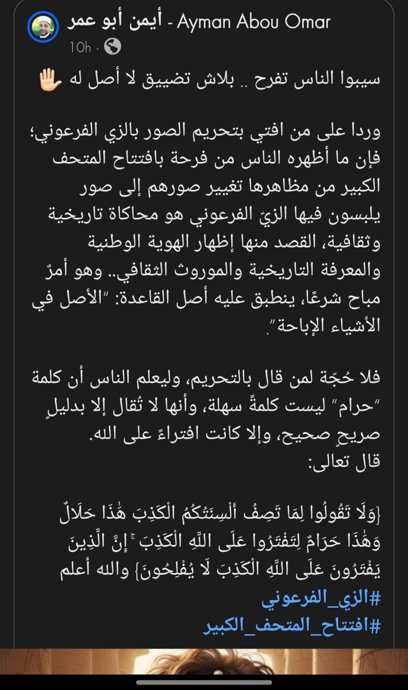 تزامنًا مع افتتاح المتحف المصري الكبير، امتلأت صفحات التواصل الاجتماعي بصور لمواطنين يرتدون الزي الفرعوني باستخدام الذكاء الاصطناعي، احتفاءً بالحدث التاريخي الذي يُعد من أبرز إنجازات الدولة المصرية الحديثة، لكن سرعان ما أثار هذا التفاعل موجة من الجدل الديني، بعد تداول منشورات وفتاوى غير رسمية تزعم أن ارتداء أو محاكاة الزي الفرعوني «حرام شرعًا» باعتباره «تشبهًا بعبدة الأوثان».