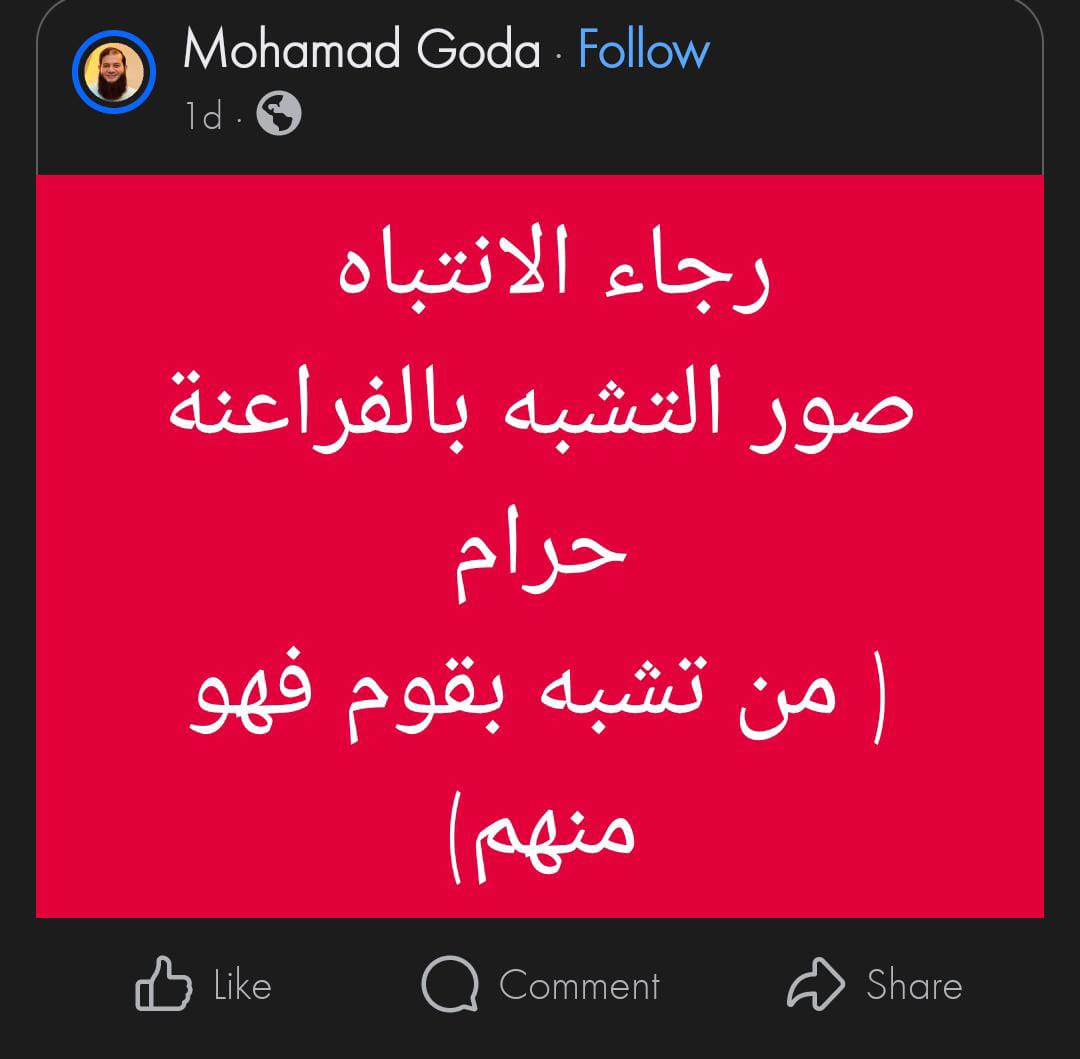 وقد جاء ذلك ردًا على مزاعم بعض المتشددين، وخاصة فتوى اطلقها داعية سلفي يُدعى محمد جودة، كانت قد انتشرت عبر مواقع التواصل الإجتماعي، يُفتي فيها المسلمين بتحريم من يستخدم الذكاء الإصطناعي لعمل صور تُحاكي الحضارة المصرية القديمة من منطلق أن الفراعنة كفار غير مسلمين، وأن من تشبه بقوم وأحبهم أصبح منهم، حيث قال: رجاء الانتباه.. صور التشبه بالفراعنة حرام ( من تشبه بقوم فهو منهم).