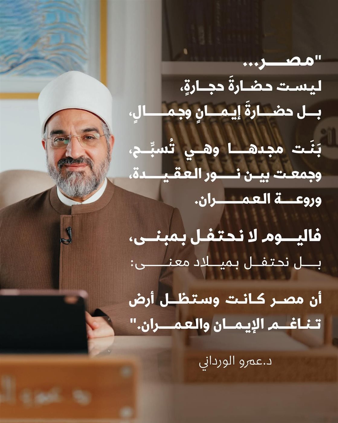 وفي ختام كلمته، دعا الدكتور عمرو الورداني قائلًا: "اللهم احفظ مصر وأهلها، واجعل من تاريخها شاهدًا على أن الإيمان كان دائمًا سرّ عبقريتها الحضارية."