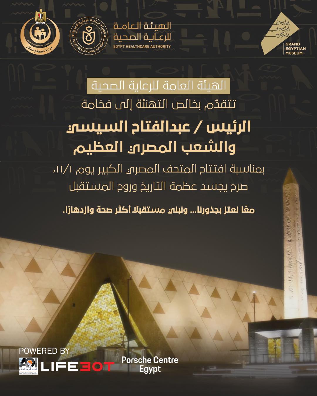 تتقدّم هيئة الرعاية الصحية برئاسة السيد الدكتور أحمد السبكي بأصدق التهاني إلى الرئيس عبد الفتاح السيسي والشعب المصري العظيم، بمناسبة الافتتاح التاريخي للمتحف المصري الكبير، أحد أعظم الصروح الحضارية في العالم، والذي يُجسّد عظمة مصر القديمة وريادتها الحديثة.