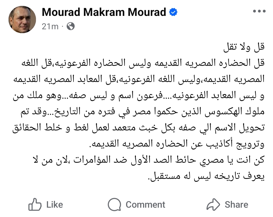 أثار الفنان مراد مكرم جدلاً واسعاً على مواقع التواصل الاجتماعي بعد منشورٍ له عبر صفحته الرسمية على فيسبوك، دعا فيه إلى ضرورة استخدام المصطلحات الصحيحة عند الحديث عن تاريخ مصر القديم.