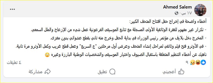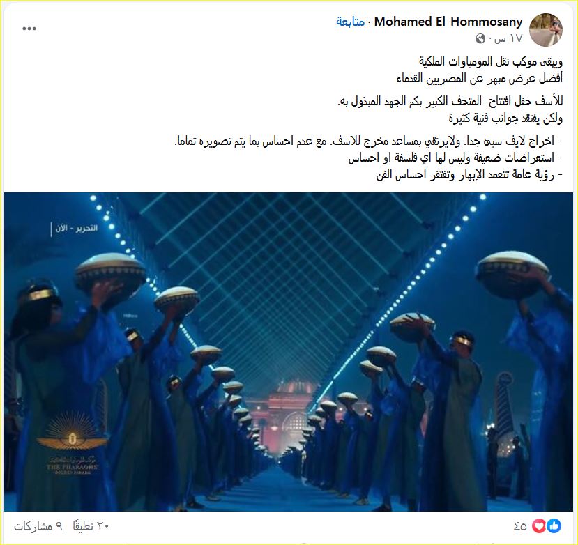 وعبّر رواد مواقع التواصل عن استيائهم من زوايا التصوير والإضاءة وضعف التغطية البصرية، رغم ضخامة الحدث ومكانته الثقافية والسياحية، مشيرين إلى أن الحفل كان يستحق معالجة فنية أكثر احترافية تعكس قيمة المتحف ومكانة مصر الحضارية.