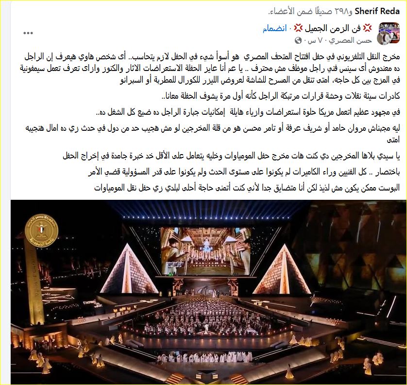 أثار حفل افتتاح المتحف المصري الكبير حالة واسعة من الجدل على مواقع التواصل الاجتماعي، بعدما شنّ عدد كبير من المصريين هجومًا لاذعًا على الإخراج التلفزيوني للحفل، معتبرين أنه لم يكن على مستوى الحدث التاريخي المنتظر منذ سنوات.