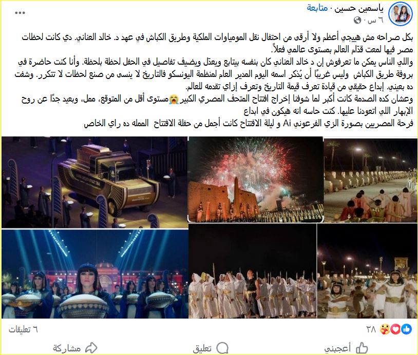 في المقابل، أشاد آخرون بمضمون الحفل وما تضمنه من فقرات فنية راقية ومشاركة لعدد من العازفين المصريين الموهوبين، مؤكدين أن الانتقادات لا تقلل من أهمية الافتتاح كحدث عالمي يضاف إلى رصيد مصر الثقافي والسياحي.