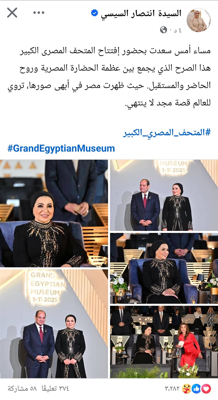 نشرت السيدة انتصار السيسي، قرينة الرئيس عبدالفتاح السيسي، عبر صفحتها الرسمية على موقع التواصل الاجتماعي "فيسبوك"، صورًا من حفل افتتاح المتحف المصري الكبير.