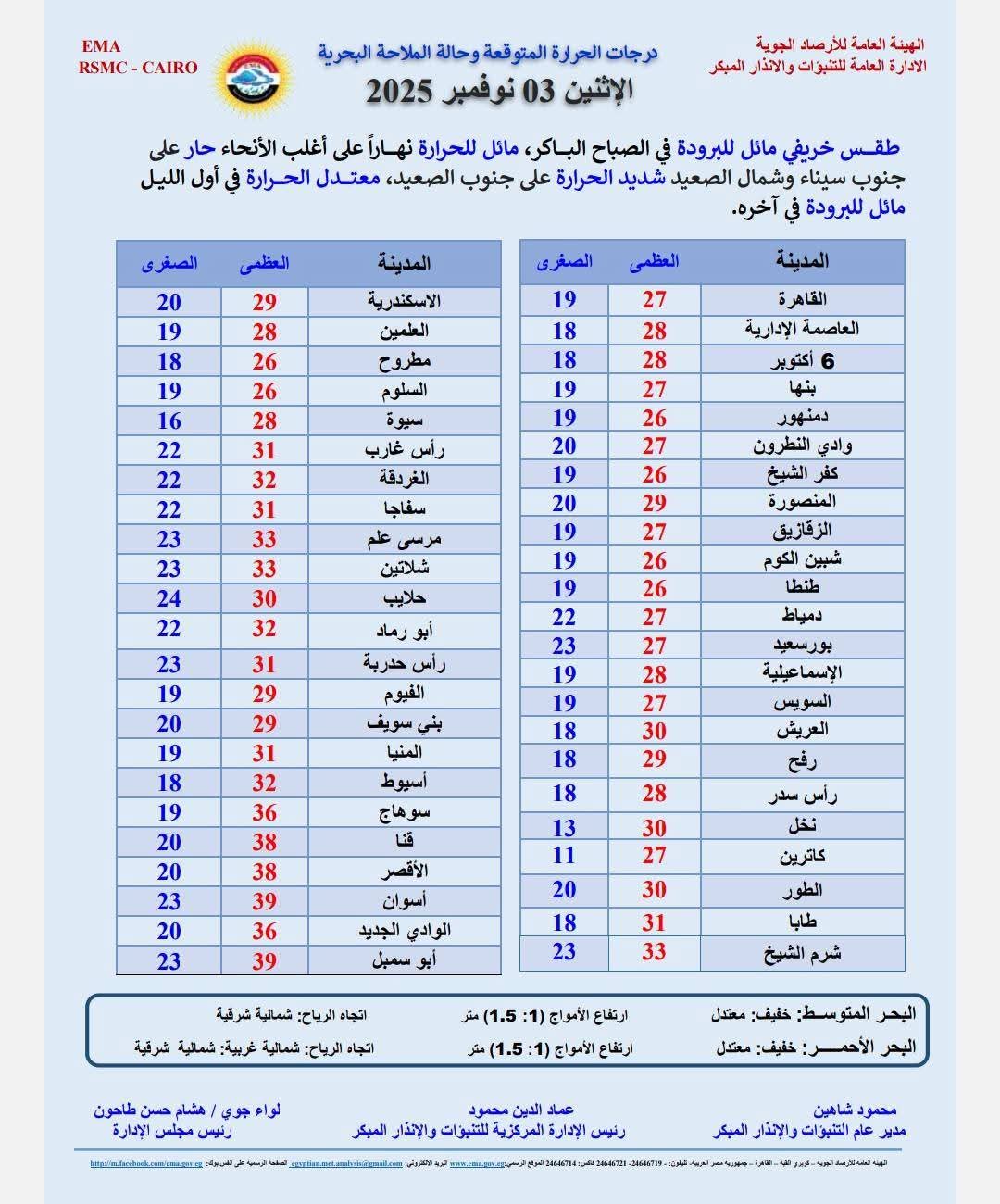 درجات الحرارة الصغرى والعظمى المتوقعة في عدد من المدن والمحافظات اليوم..
