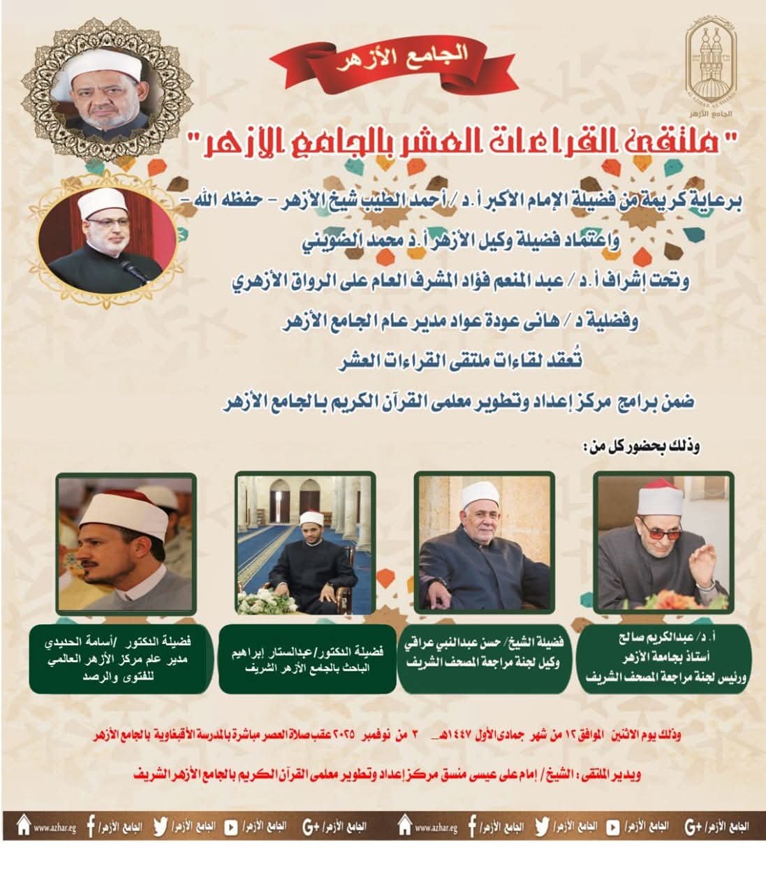 وصرح الدكتور عبد المنعم فؤاد المشرف العام على الأنشطة العلمية للرواق الأزهري بالجامع الأزهر، أن هذا البرنامج يأتي ضمن سلسلة من الأنشطة والبرامج التي ينظمها مركز إعداد وتطوير معلمي القرآن الكريم بالجامع الأزهر، ويهدف إلى قراءة القرآن الكريم برواية الإمام قالون عن الإمام نافع المدني، وذلك بعد الانتهاء من ختمتين الأولى بالقراءات السبع، والثانية بالقراءات الثلاثة المتممة للعشر، بواقع نصف جزء يومياً، مع تقديم شرح مفصل للتلاوة وتعريف بأصول القراء ومذاهبهم، كما سيتناول الملتقى التنبيه على الكلمات الفرشية المختلف فيها بين القراء، مما يسهم في تعزيز الفهم العميق للقراءات العشر المتواترة ورفع مستوى التلاوة بين المشاركين.