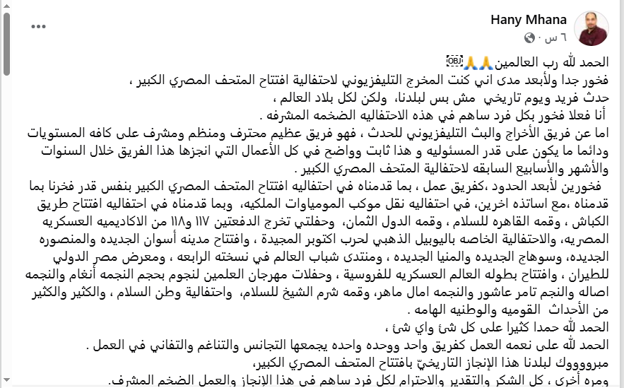 بدأ المخرج هاني مهنا حديثه عبر حسابه على فيس بوك قائلاً: "فخور جدًا ولأبعد مدى إني كنت المخرج التليفزيوني لاحتفالية افتتاح المتحف المصري الكبير، حدث فريد ويوم تاريخي مش بس لبلدنا ولكن لكل بلاد العالم، وأنا فعلًا فخور بكل فرد ساهم في هذه الاحتفالية الضخمة المشرفة".