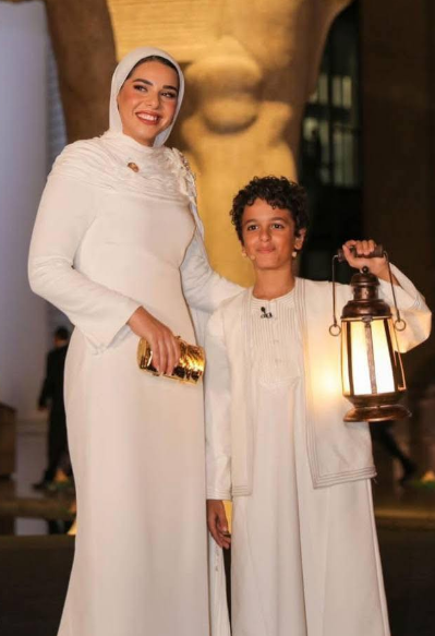 وتألقت آية السيسي بإطلالة بيضاء لتبرز دلالته في الحياة الفرعونية فهو يرمز إلى النقاء والصفاء والرفعة الاجتماعية، وكان يرتديه الملوك والنبلاء، مرتدية فستان طويل مجسم، مع كاب طويل منسدل أضاف لمسة ملكية راقية، صمم من قماش الكريب باللون الأبيض زين بالتطريزات مستوحاة من الرموز الفرعونية باللغة الهيروغليفية، وزيّن الفستان ببروش على شكل زهرة اللوتس، أى الزهرة المقدسة التى كانت ترمز للنقاء والبعث من جديد عند قدماء المصريين.