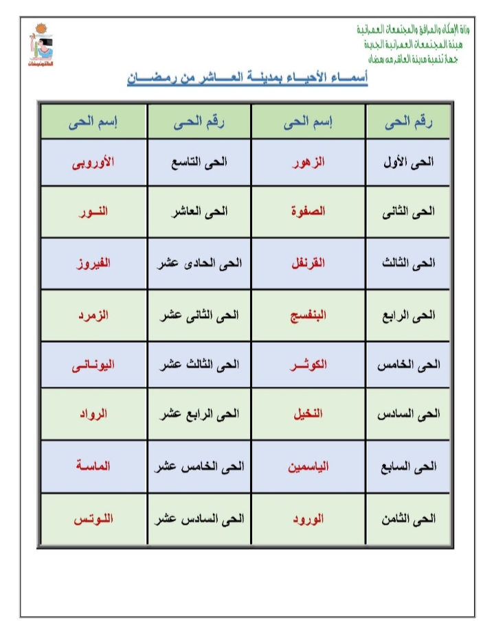 ومن أبرز الأسماء الجديدة التي تم اعتمادها في حدائق العاشر: حي النرجس، حي الياسمين، حي المسك، حي القرنفل، حي الزيتون، حي الأشجار، حي الروضة، وحي الماسة.