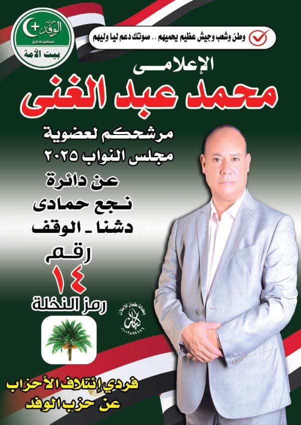 هذا ويواصل محمد عبد الغنى مرشح الوفد بالدائرة الثالثة، جولاته الانتخابية بمحيط دائرته الانتخابية والتى تضم مراكز نجع حمادى ودشنا والوقف، وذلك لعرض برنامجه الانتخابى على أهالى دائرته.