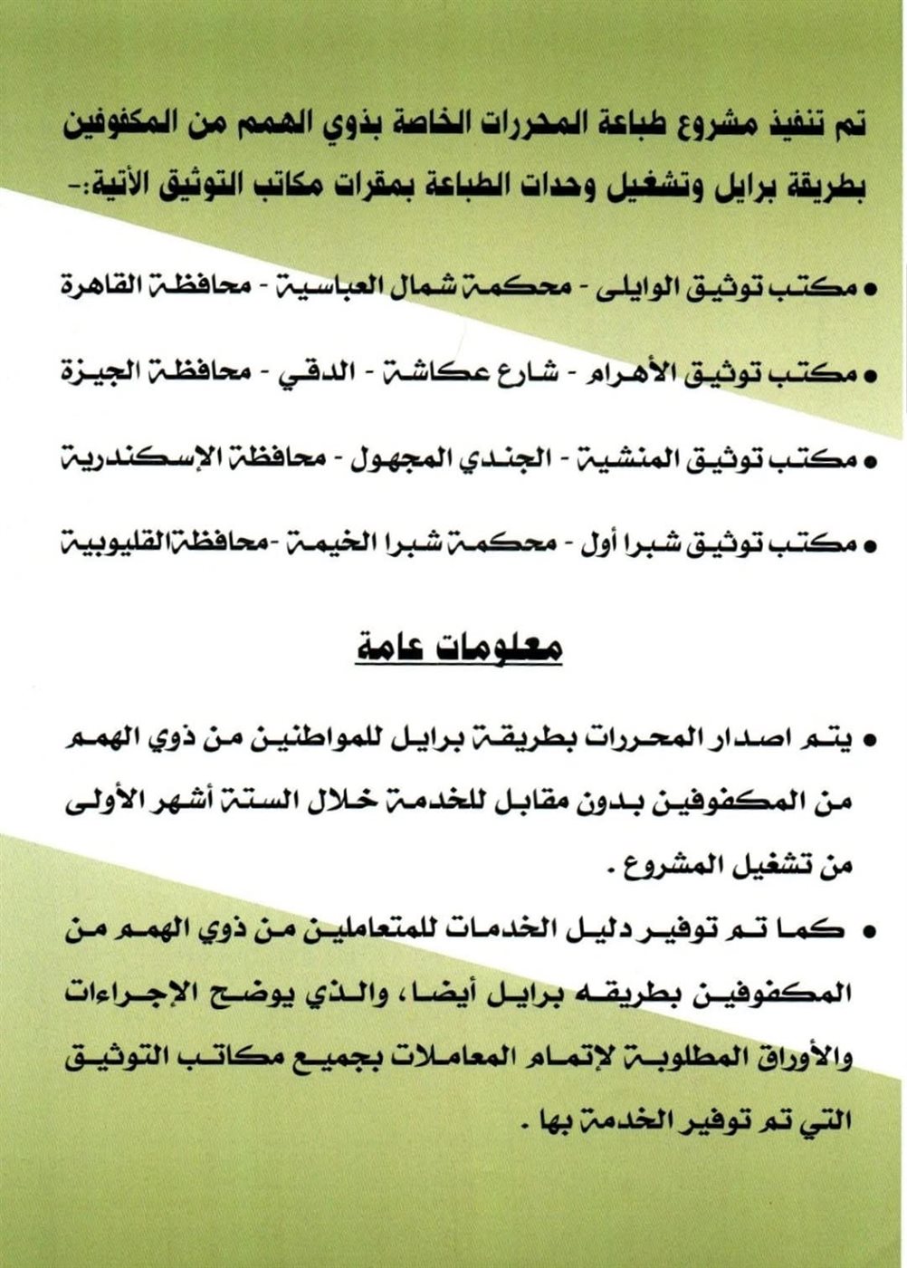 يجدر بالذكر أنه يتم إصدار المحررات بطريقة برايل للمواطنين من ذوي الإعاقة البصرية بدون مقابل للخدمة خلال الستة أشهر الأولى من تشغيل المشروع.