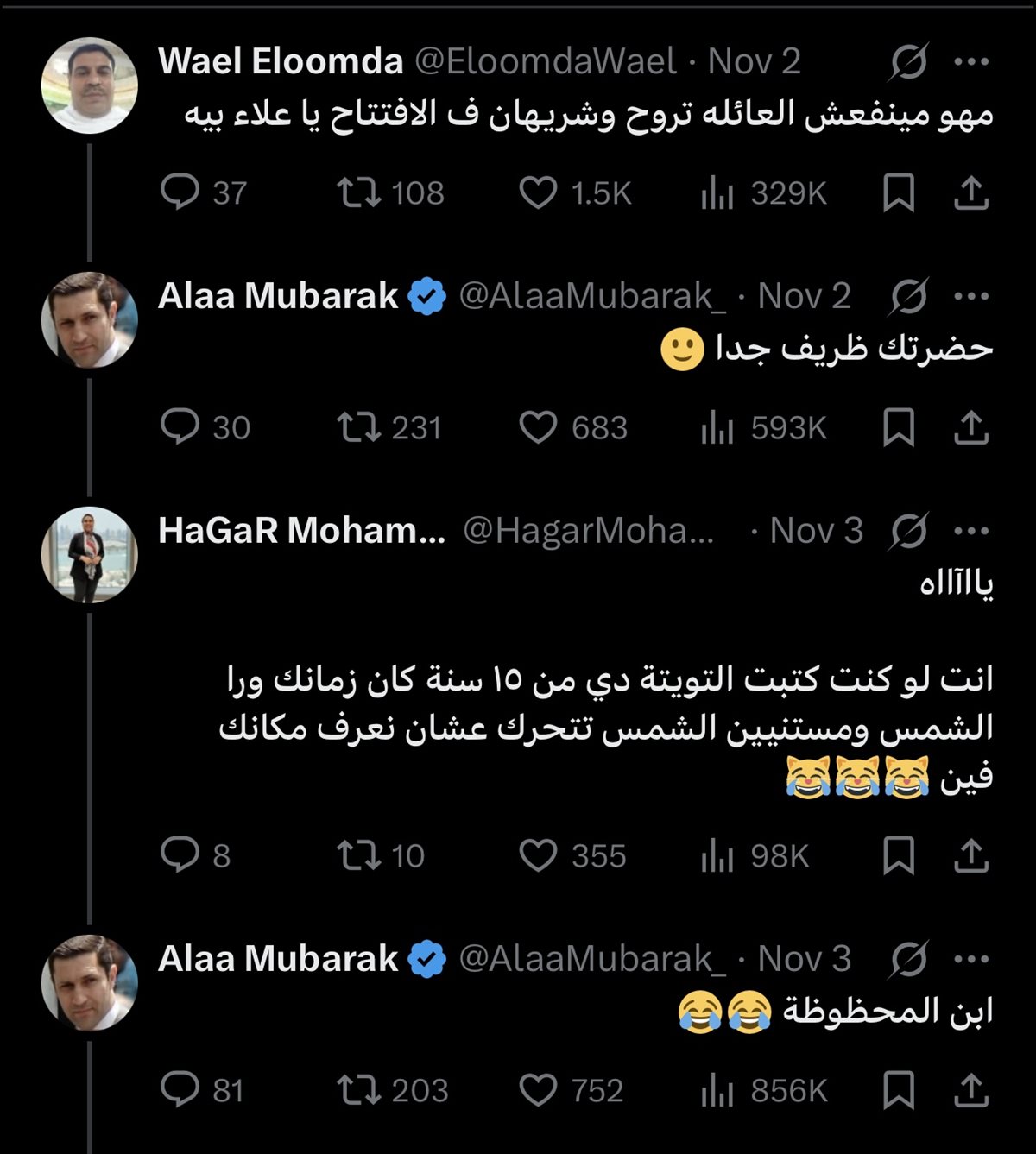رد متابع على تعليق متابع آخر لعلاء مبارك التي لمح من خلالها أن أسرة مبارك تغيبت عن حفل افتتاح المتحف المصري الكبير بسبب مشاركة شريهان في فعاليات الحفل، حيث قال: “مهو مينفعش العائلة تروح وشريهان في الافتتاح يا علاء بيه”، ليرد عليه علاء قائلًا: “حضرتك ظريف جدًا”، الأمر الذي أثار دهشة الرواد بسبب تفاعل ابن مبارك مع متابعيه.