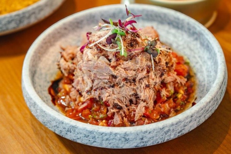 التقديم: ضعي الصلصة في قاع الطبق، وأضيفي فوقها الدجاج المفتت، وزيني بالبذور أو الأعشاب الطازجة.